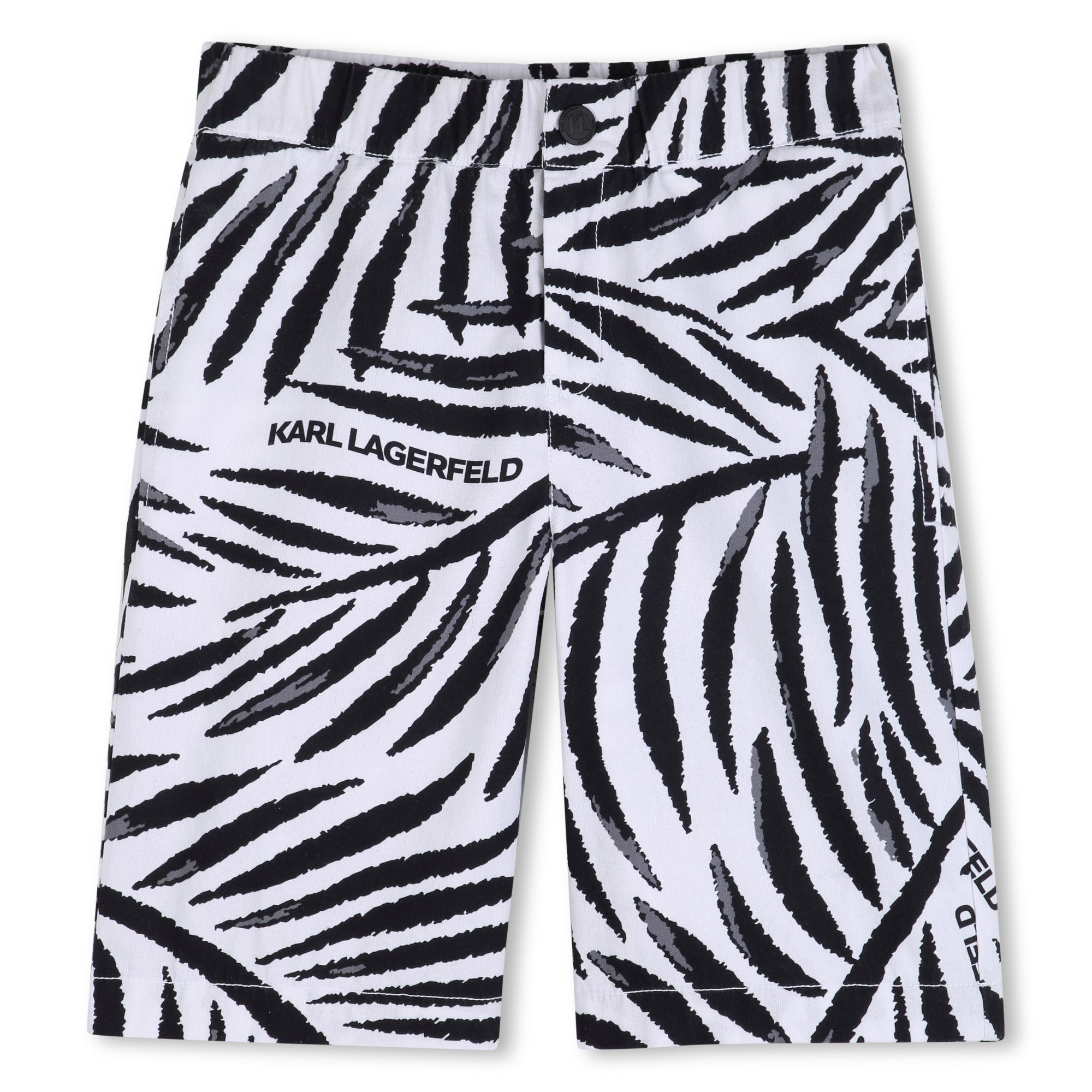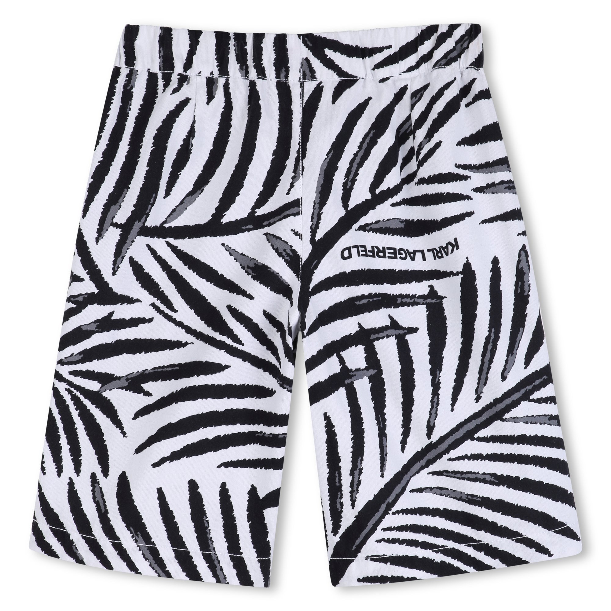 • White Bermuda shorts with a black palm tree print. Button and zip fastening.