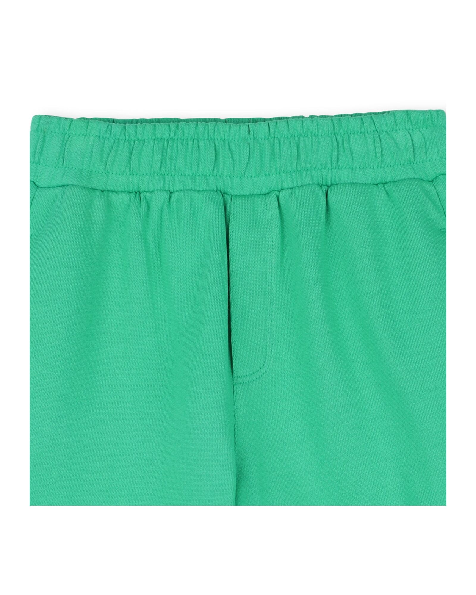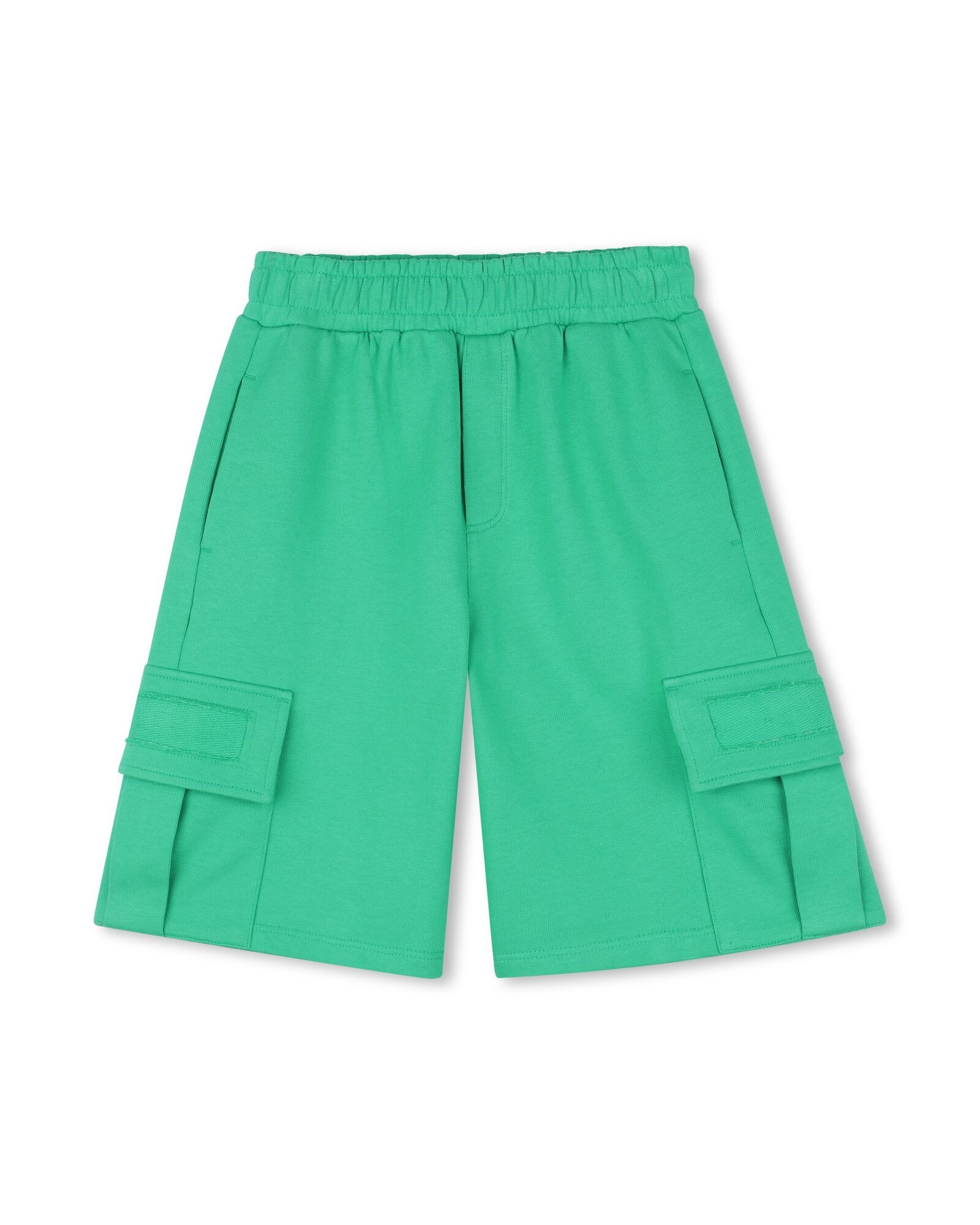 • Green Bermuda shorts with side pockets and an elasticated waistband.