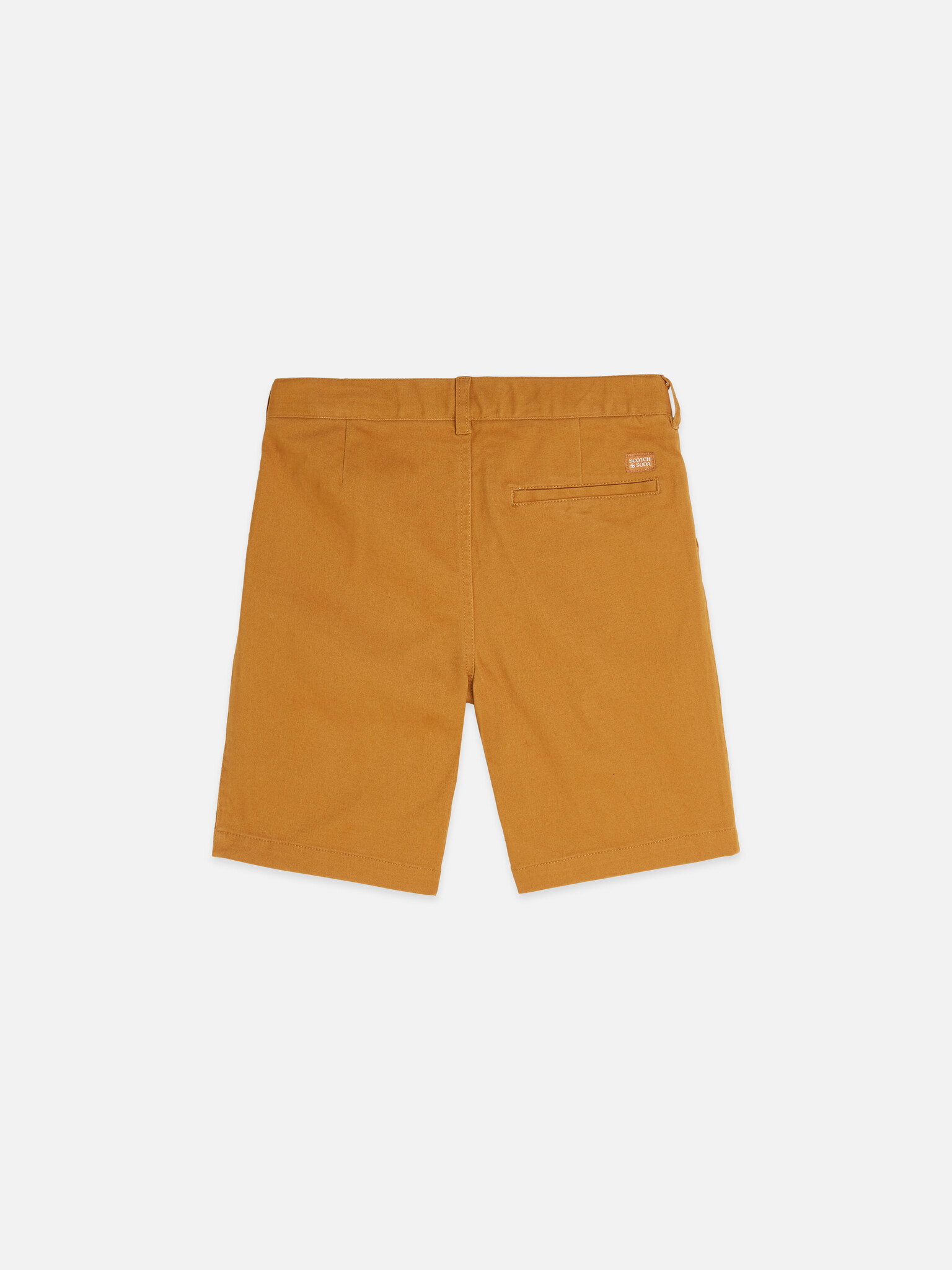 • Rust-colored Bermuda shorts with a small red logo on the front pocket.