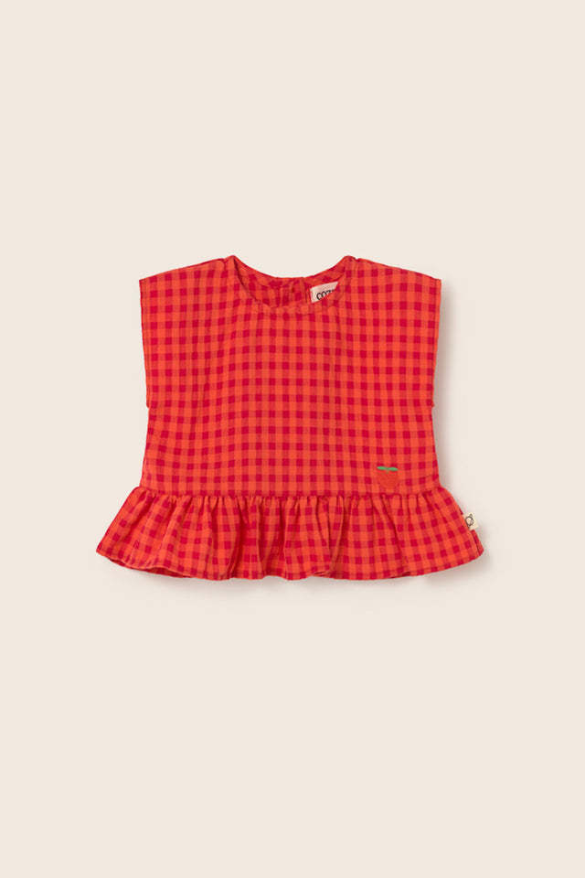 • Cotton top with gingham pattern featuring a round neckline with buttons at the back, sleeveless cut, and gathered ruffle at the hem.