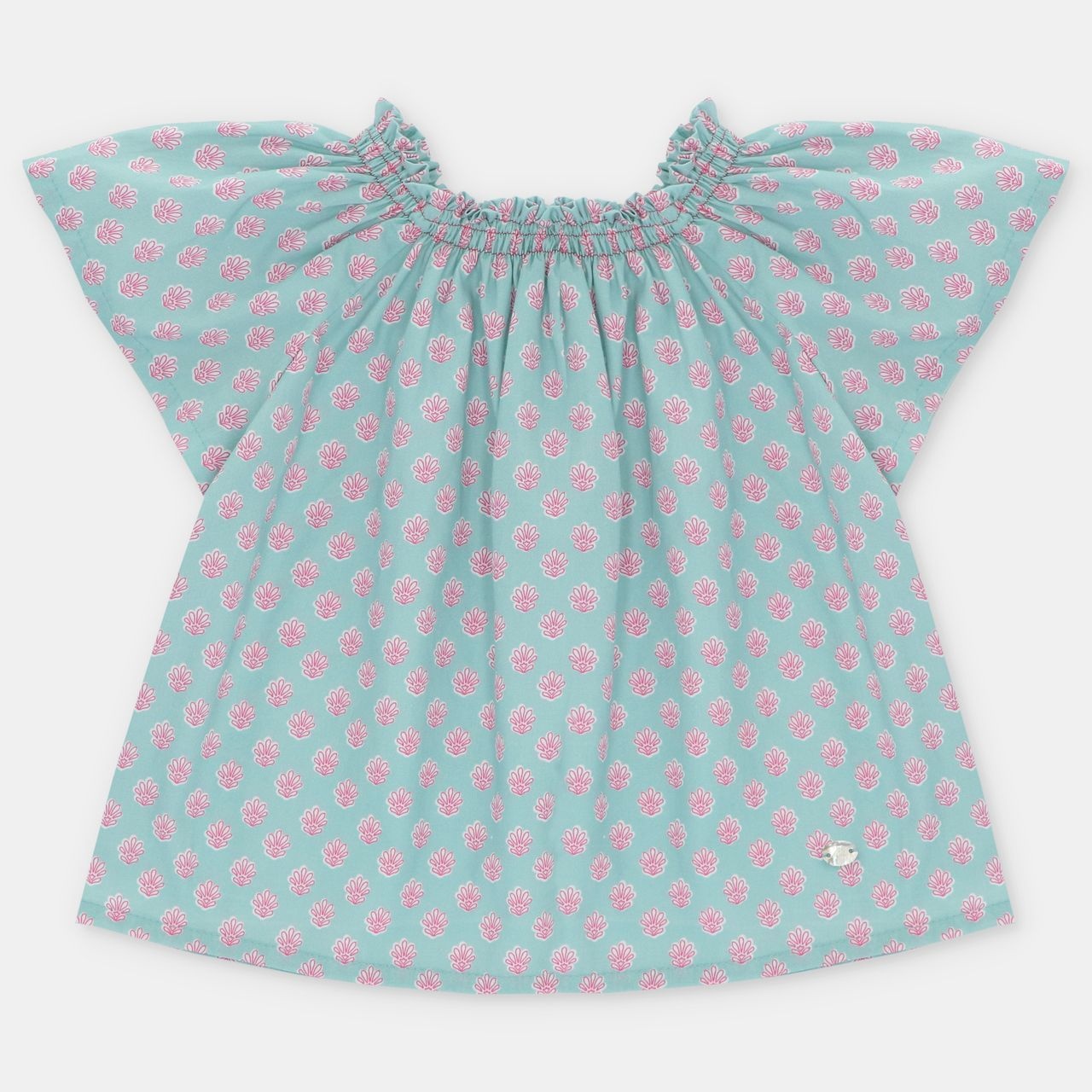 • Short-sleeved printed blouse in turquoise and pink.