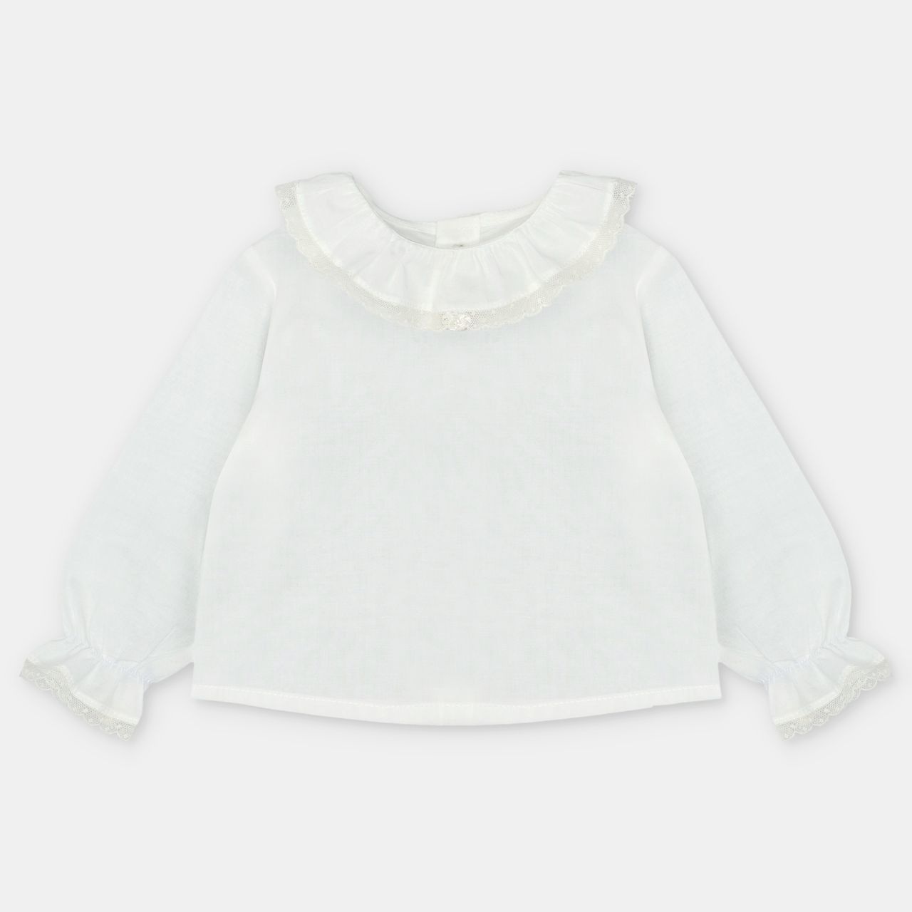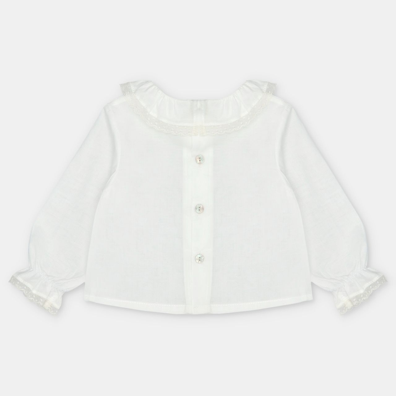 • Long-sleeved white blouse with pretty collar and buttonholes at the back.