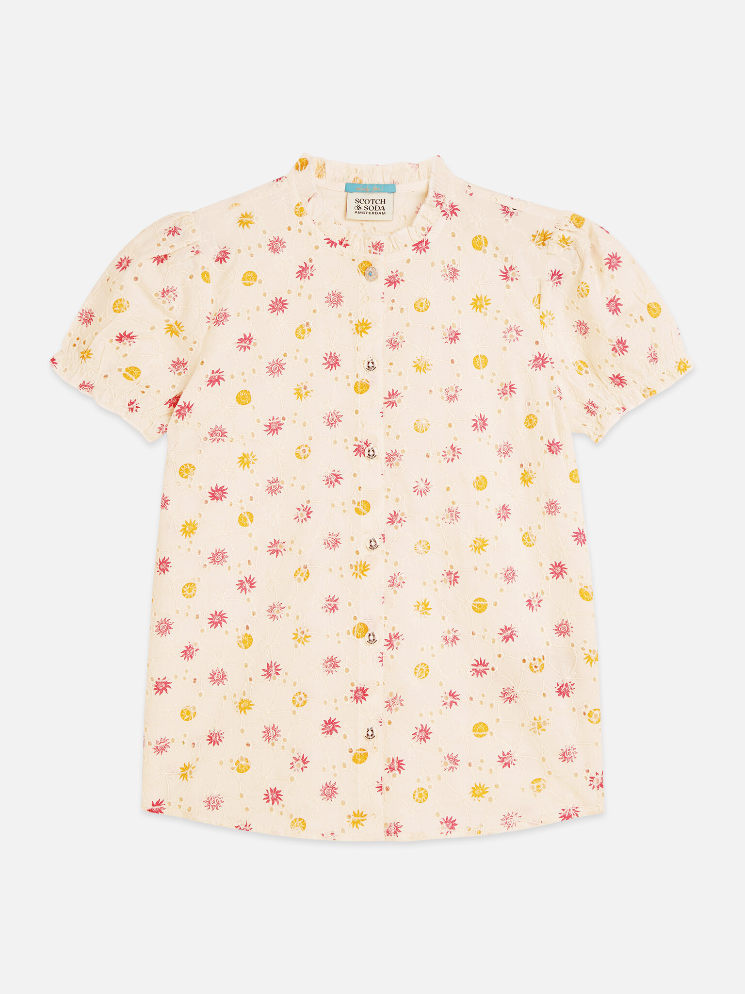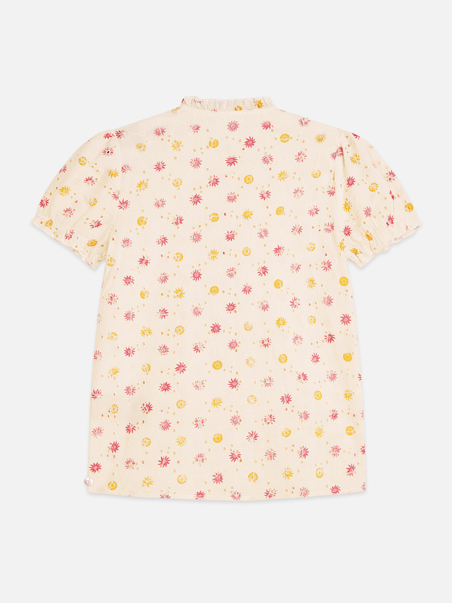• White embroidered blouse with pink and orange details. Button fastening at the front.