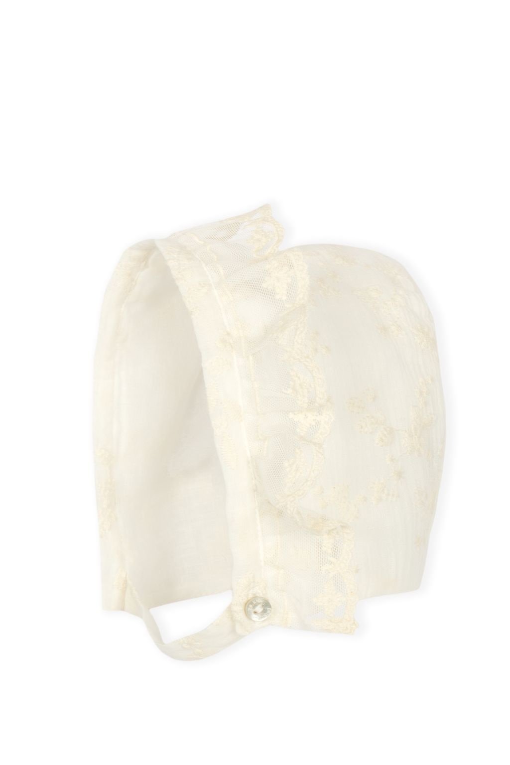 • Pretty ivory-colored bonnet trimmed with lace.