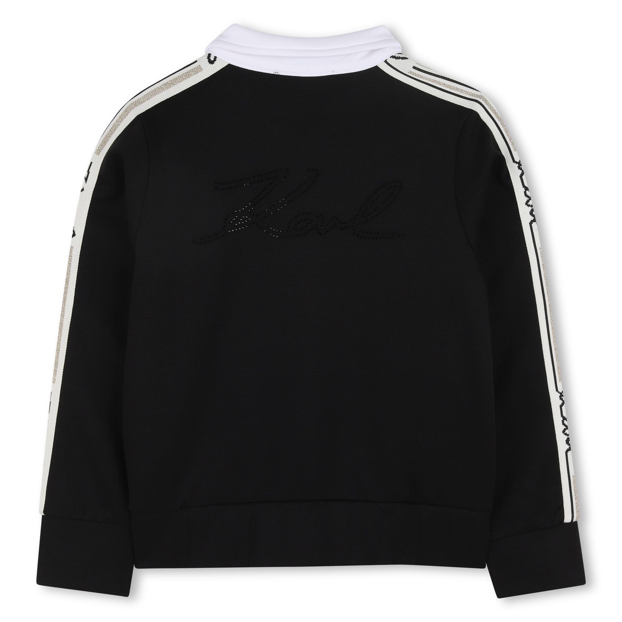 • Black and white cardigan with gold detailing along the arms and a zip closure. Small black diamond lettering on the back.