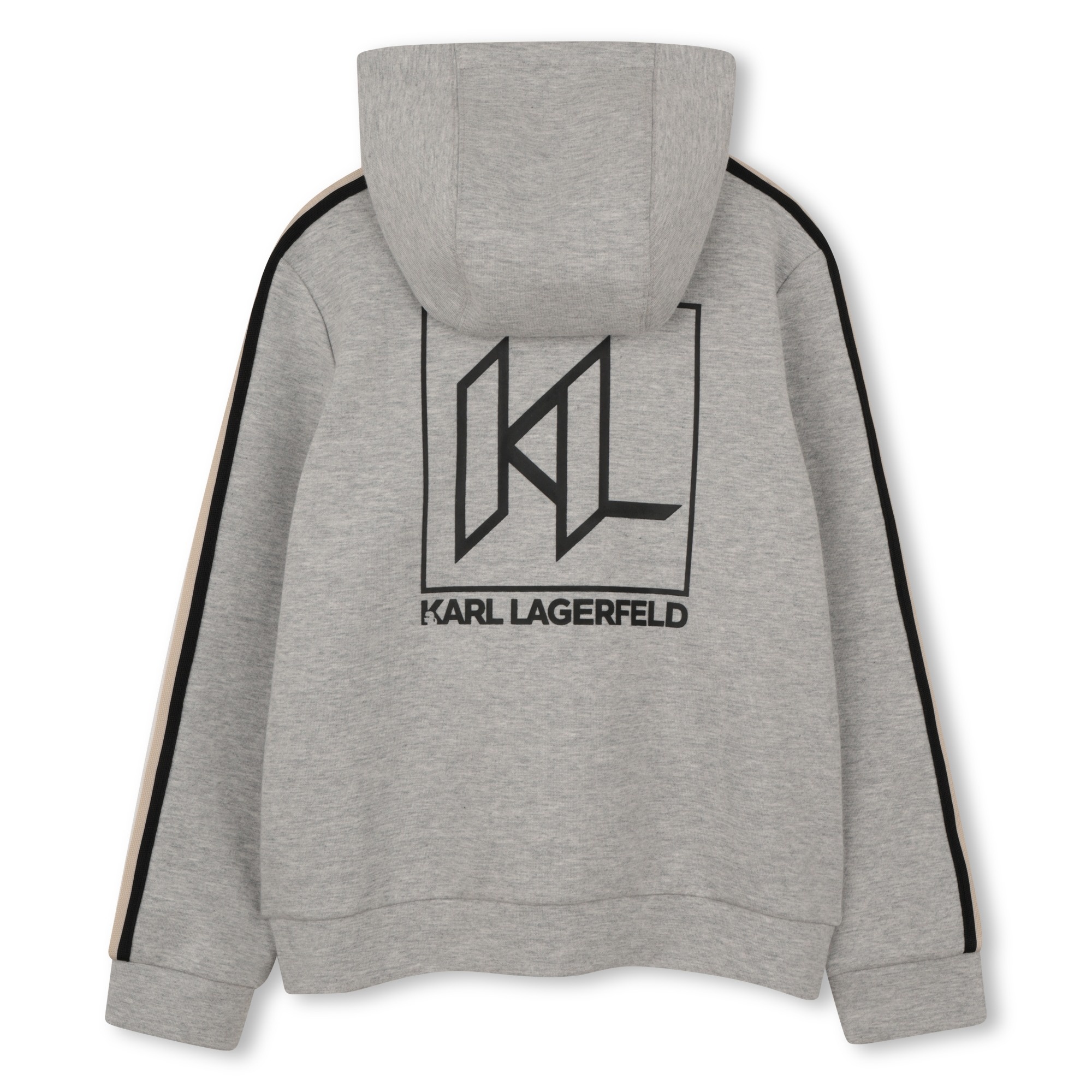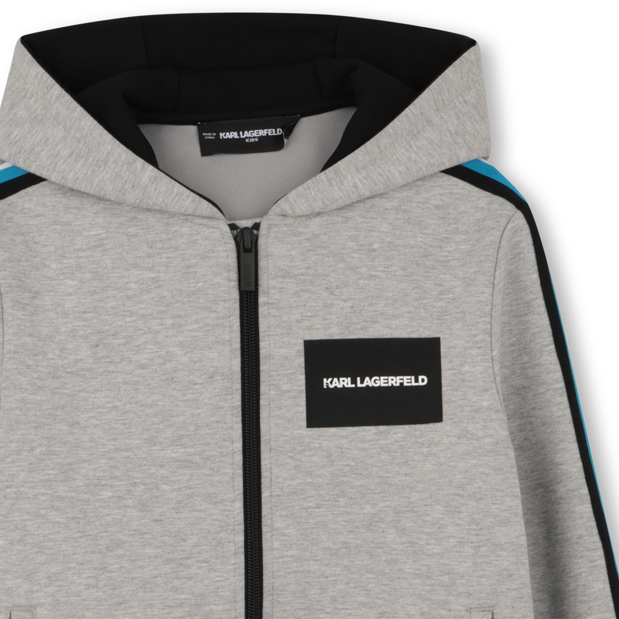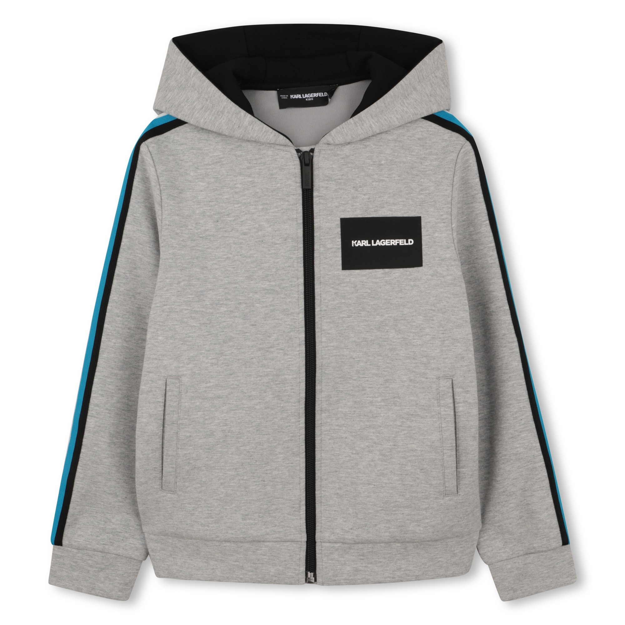 • Grey hooded cardigan with colorful details along the sleeves. Black zip fastening, front pockets. Black print on the back.