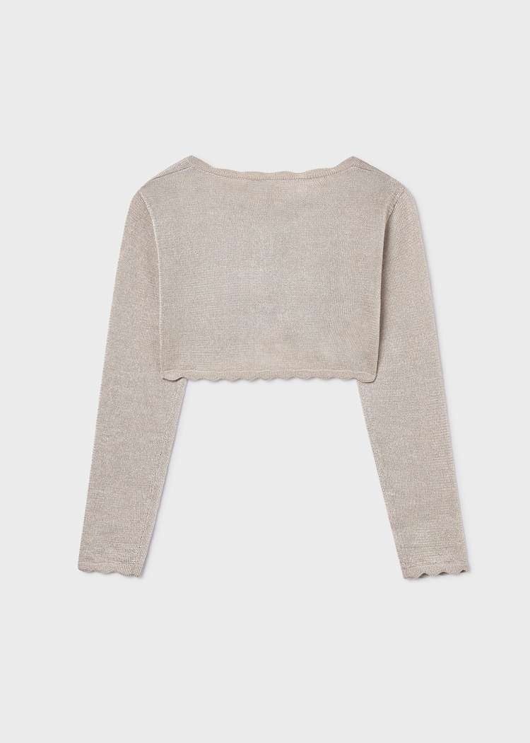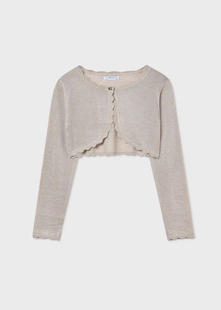 • Short almond-colored knit cardigan.