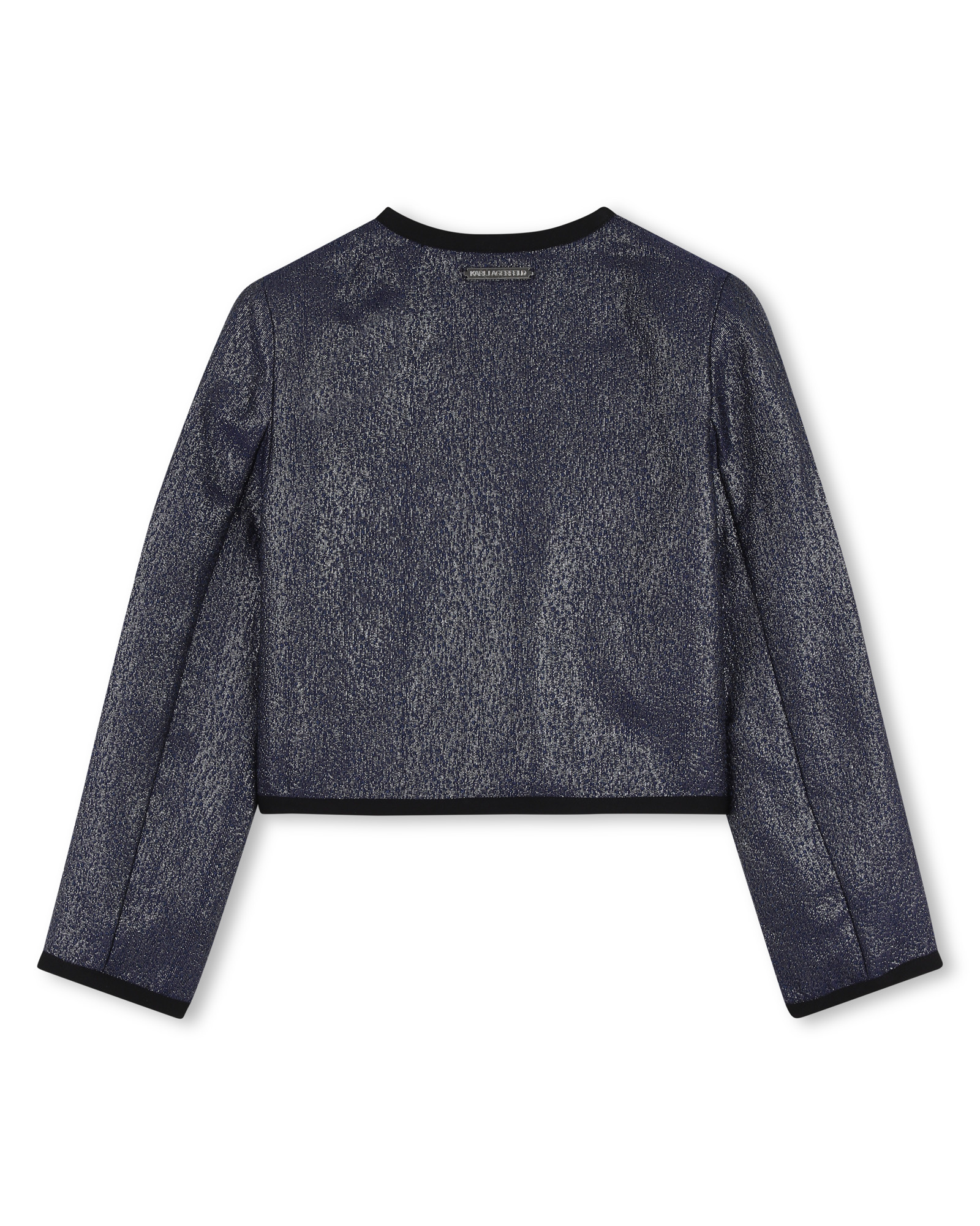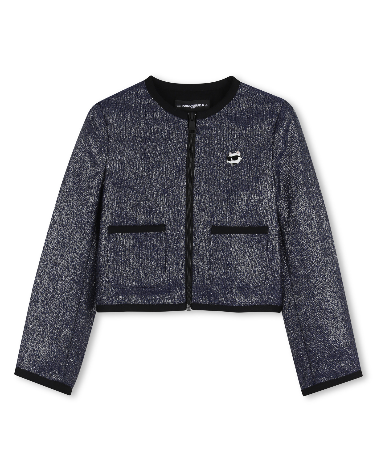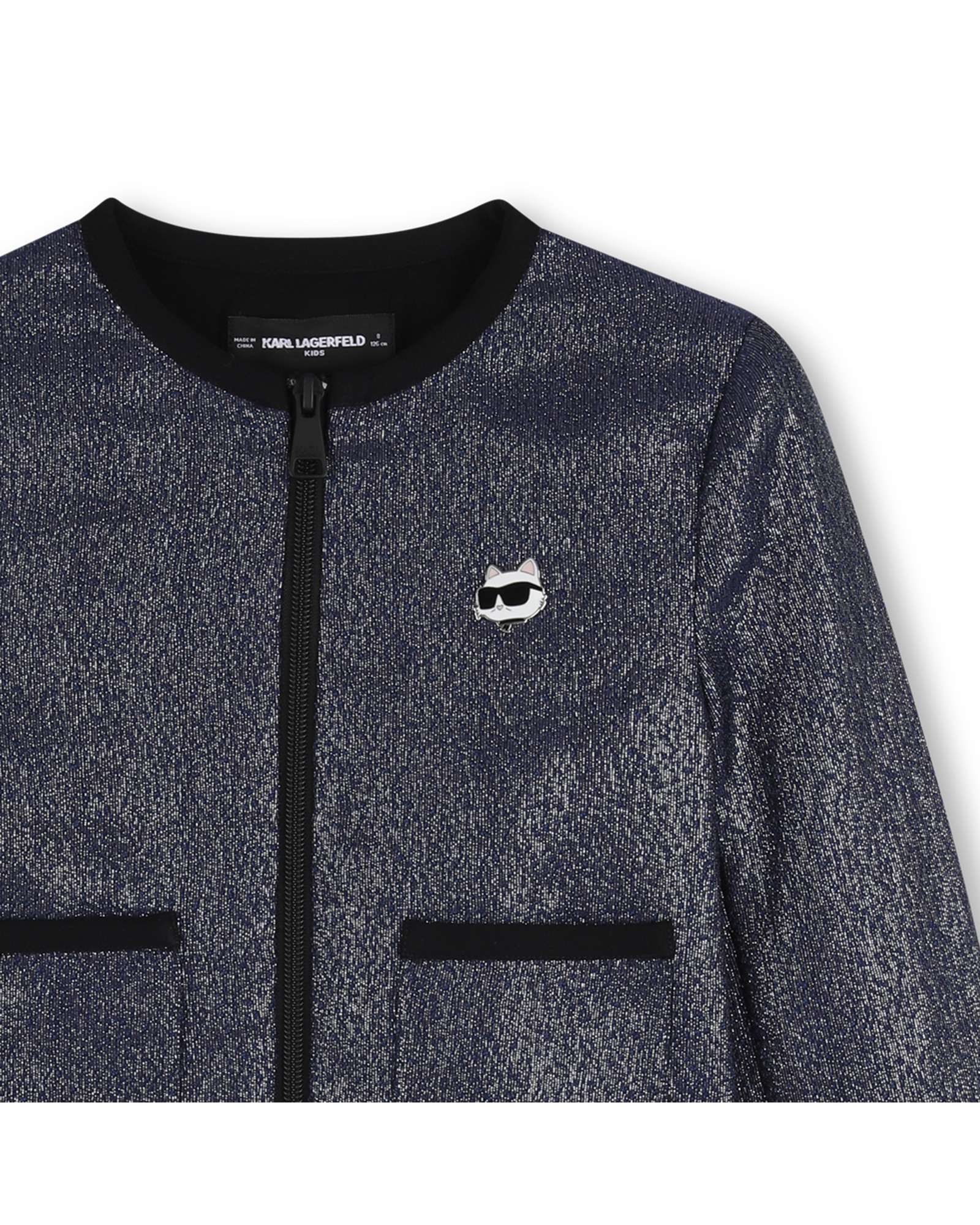 • Shiny navy cardigan with zip fastening and kitten pin at the front.