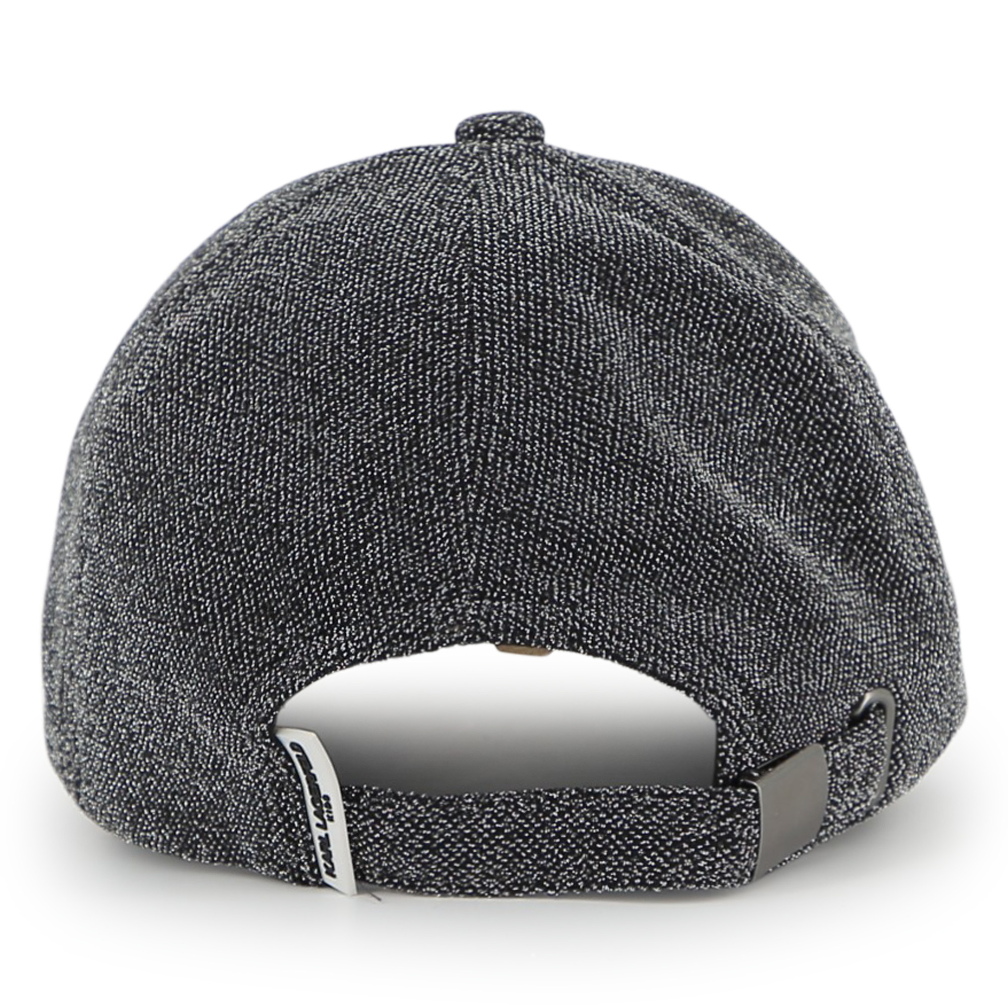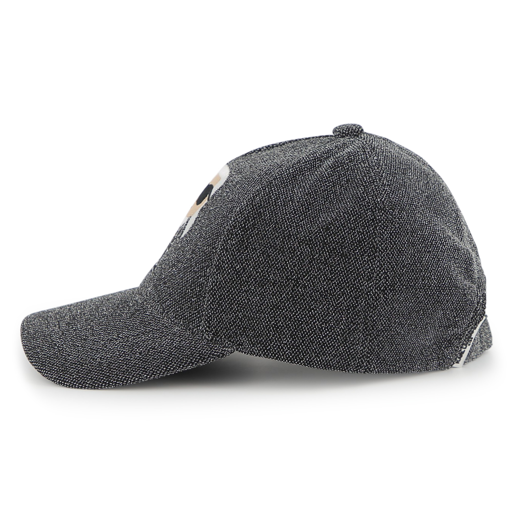 • Glossy black cap with a little man logo and woven kitten on the front.