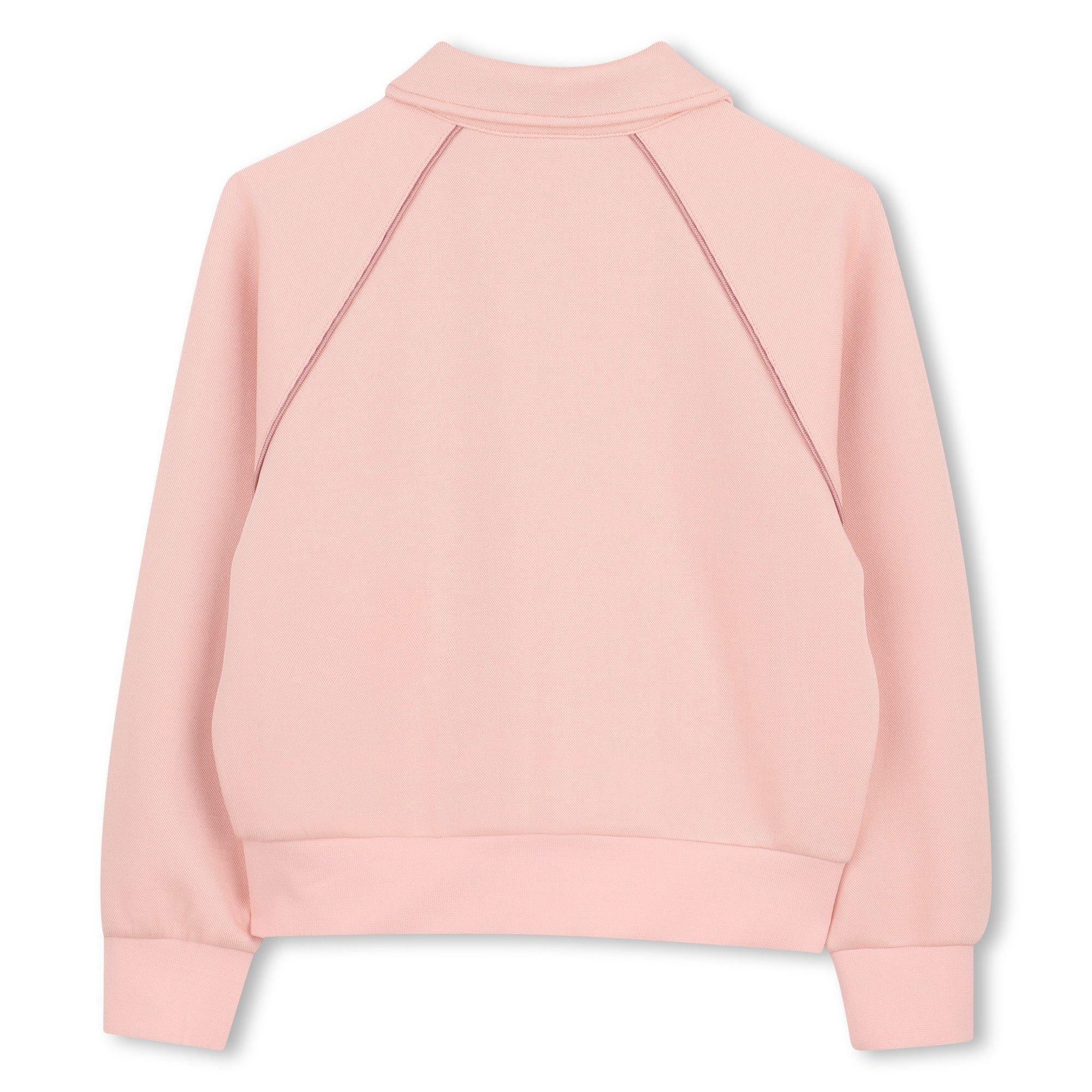 Pink pants with side pockets and fabric drawstrings. Seam detailing runs the length of the leg.