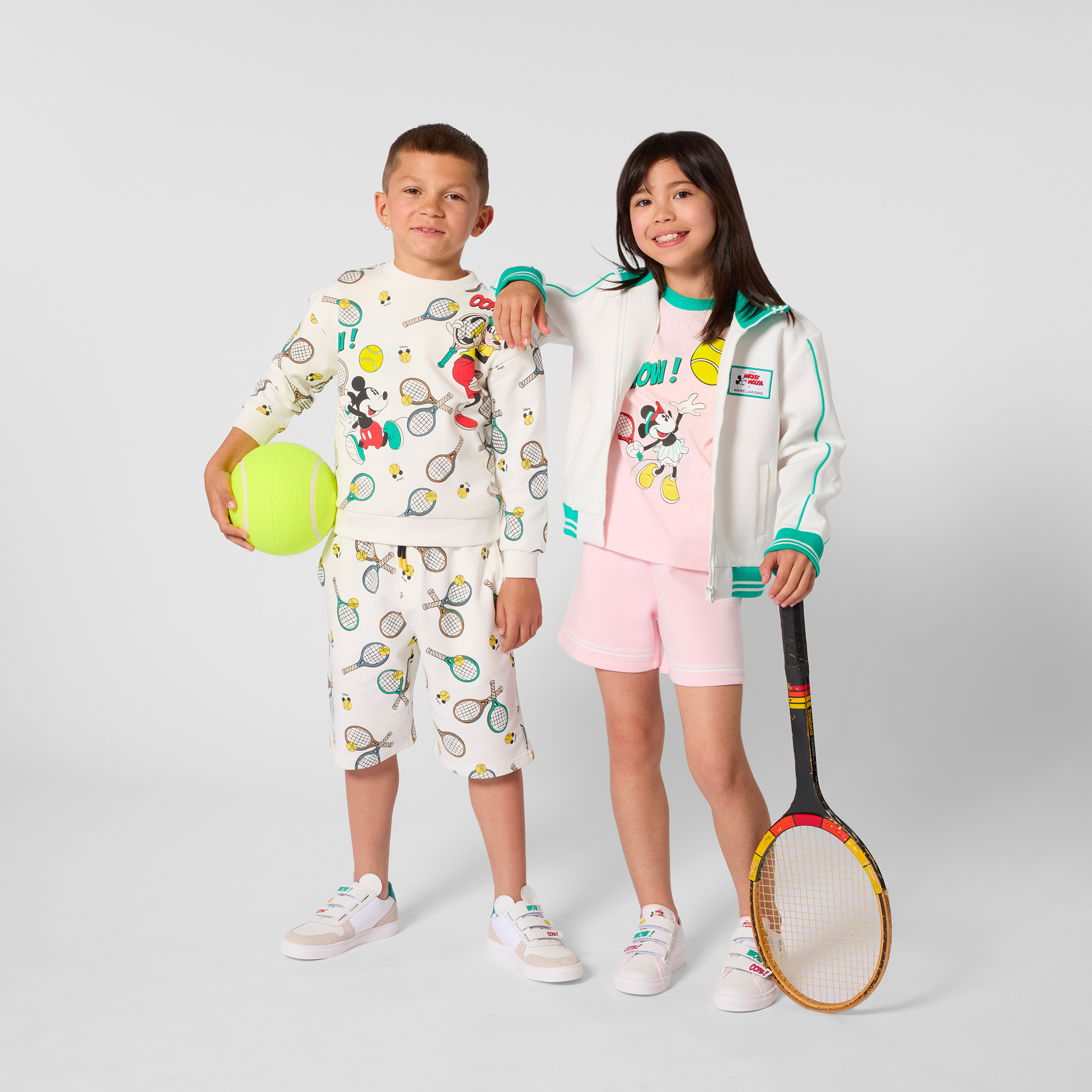 • White long-sleeved sweater with a colorful Mickey & Goofy tennis print.