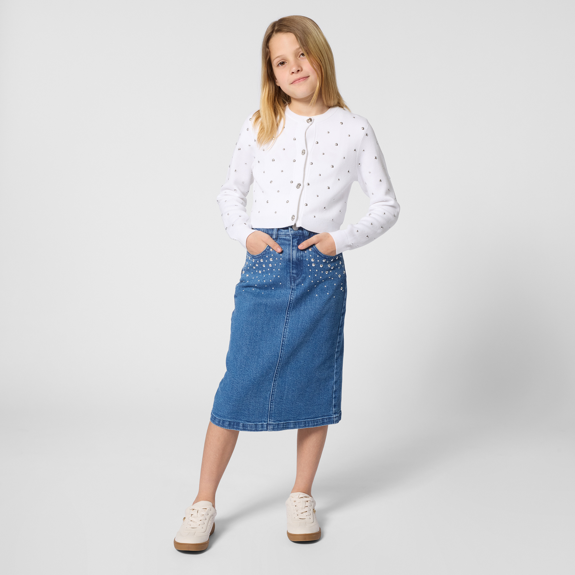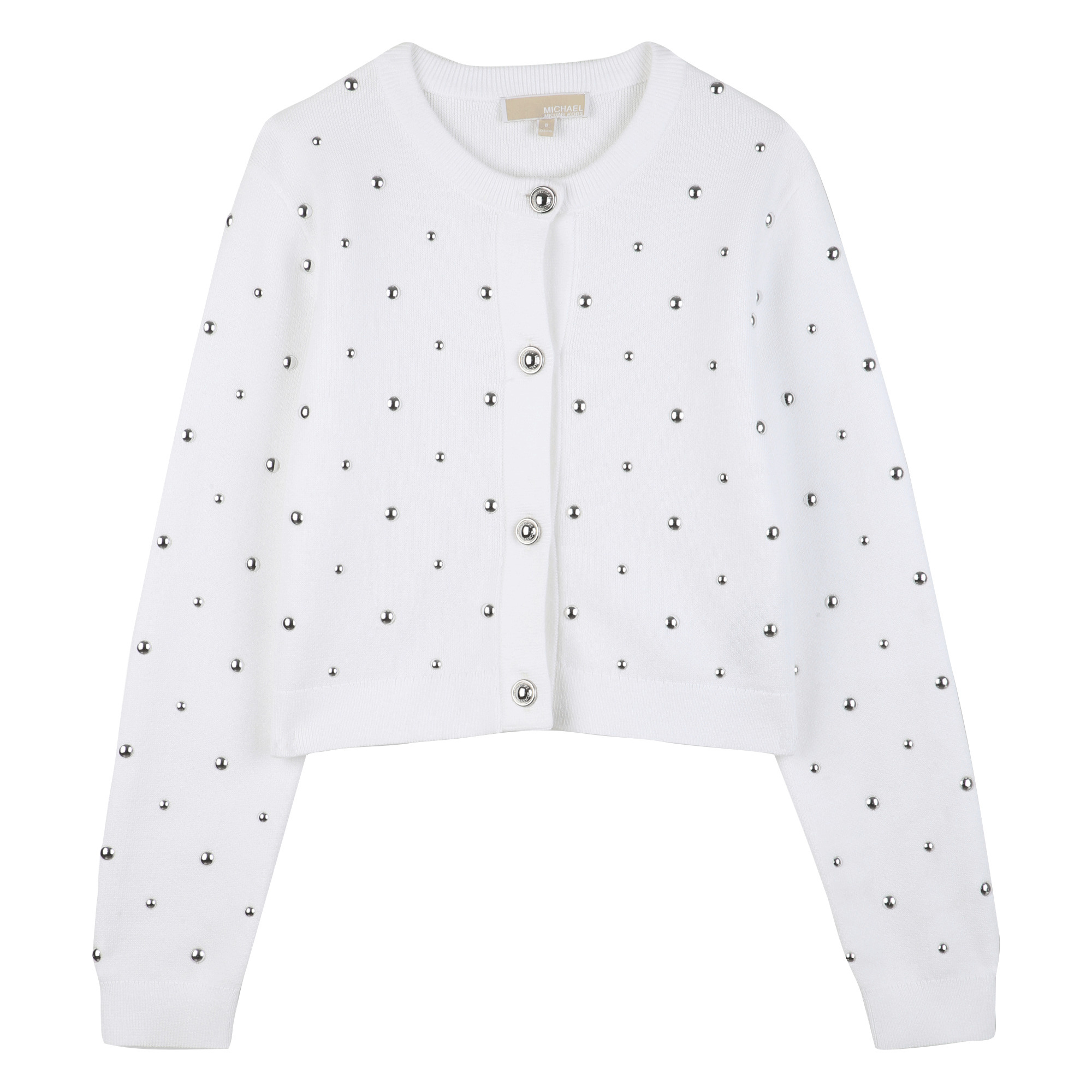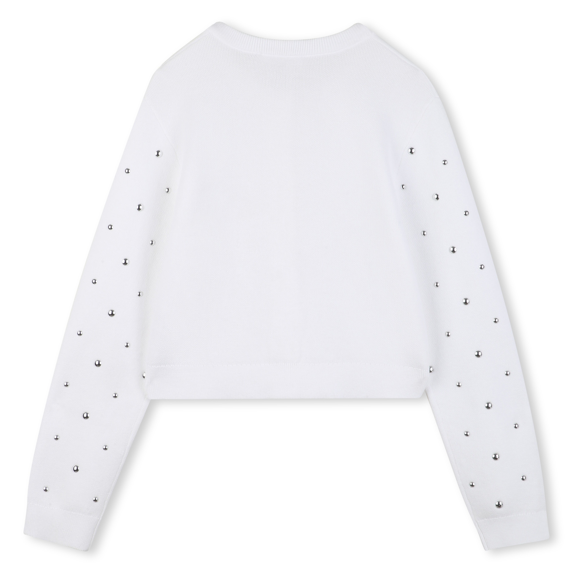 • White sweater with button placket and silver stud details.