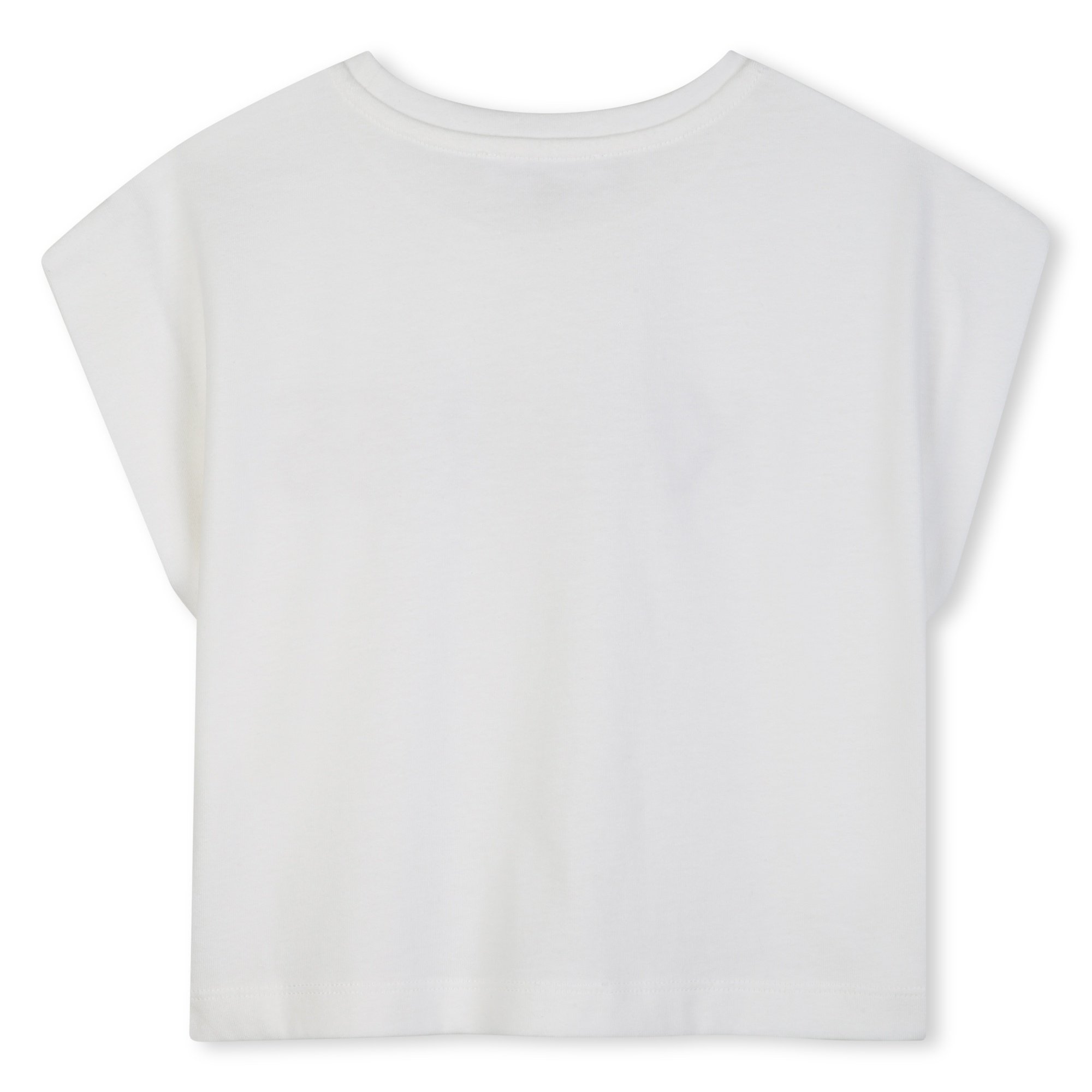 • Short-sleeved T-shirt with beige/gold lettering on the front.