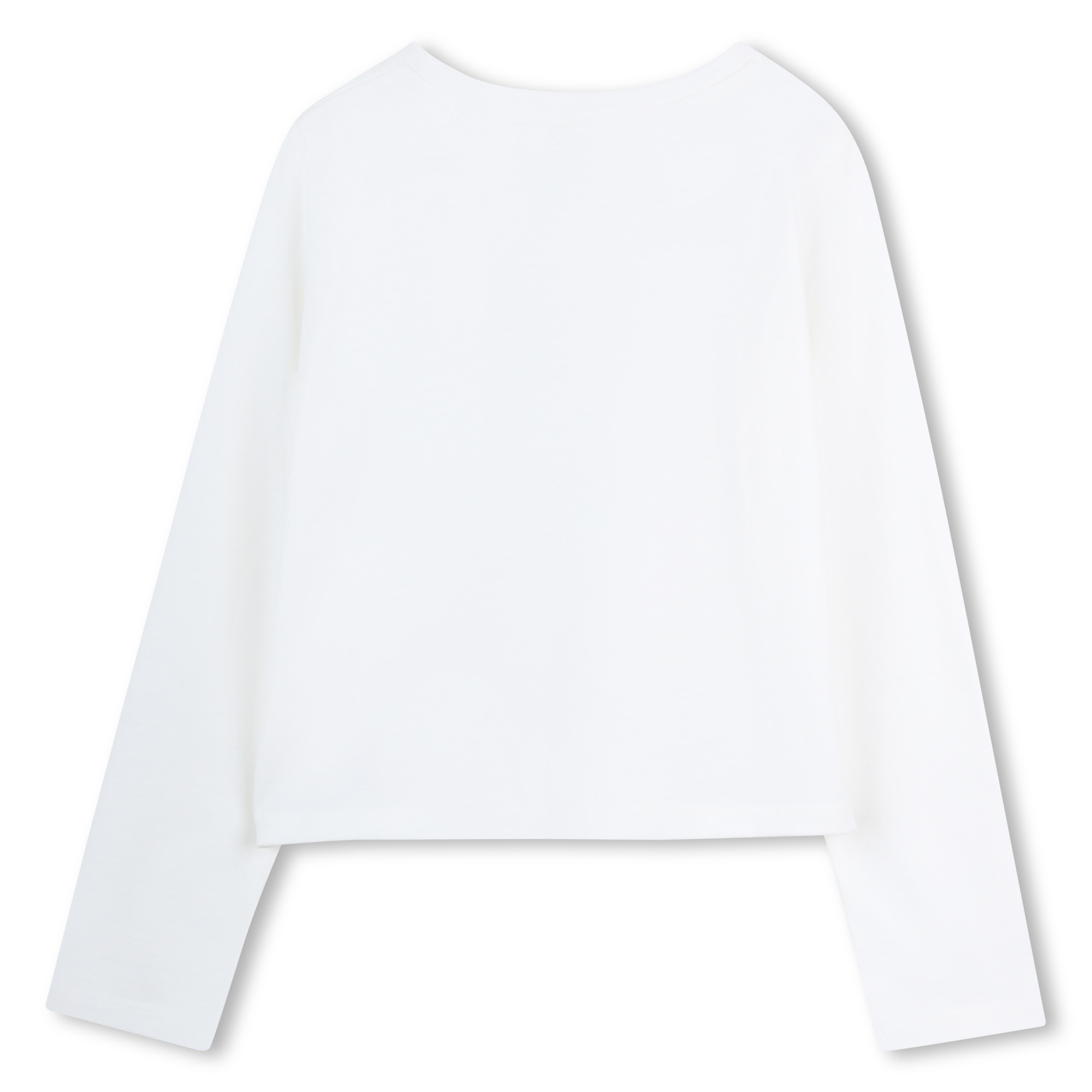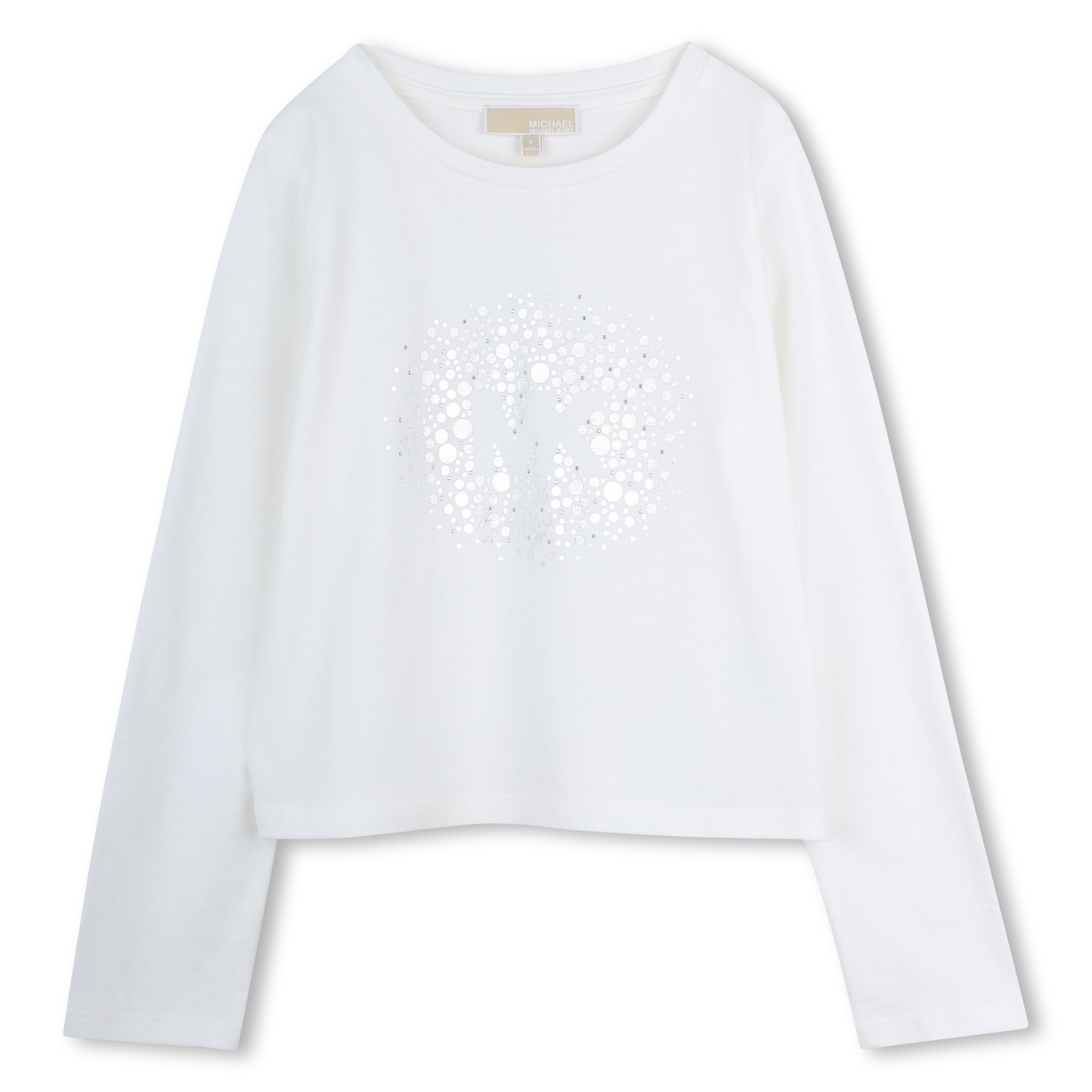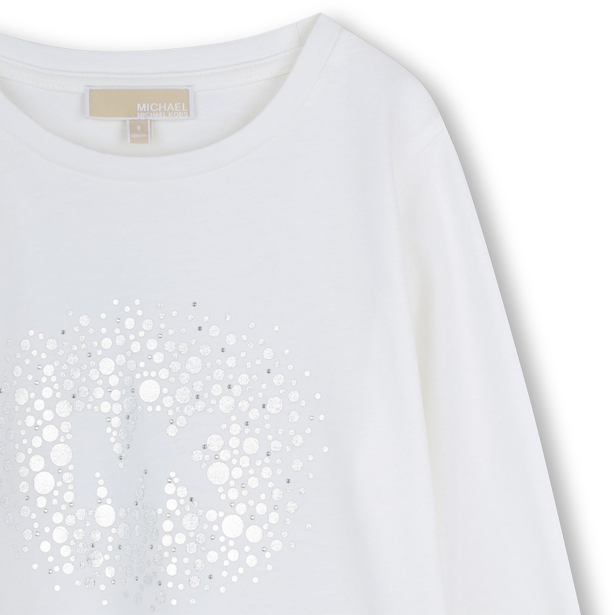 • White long-sleeved sweater with a silver "MK" logo on the front.