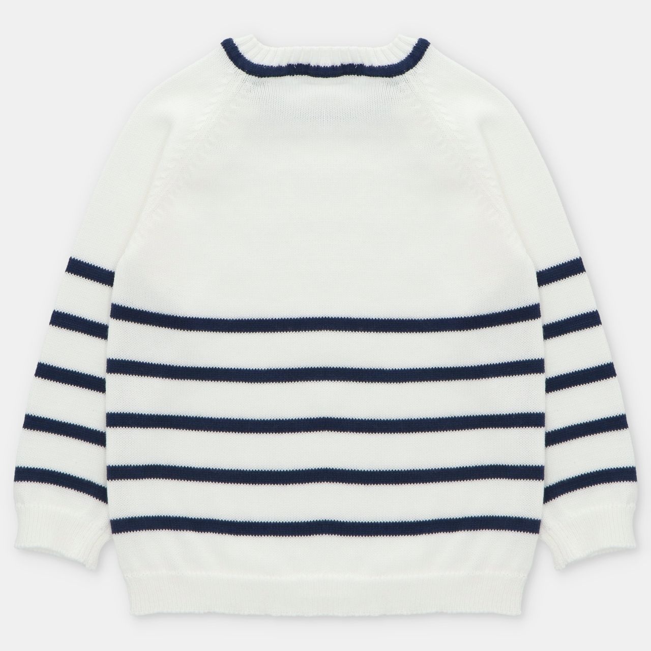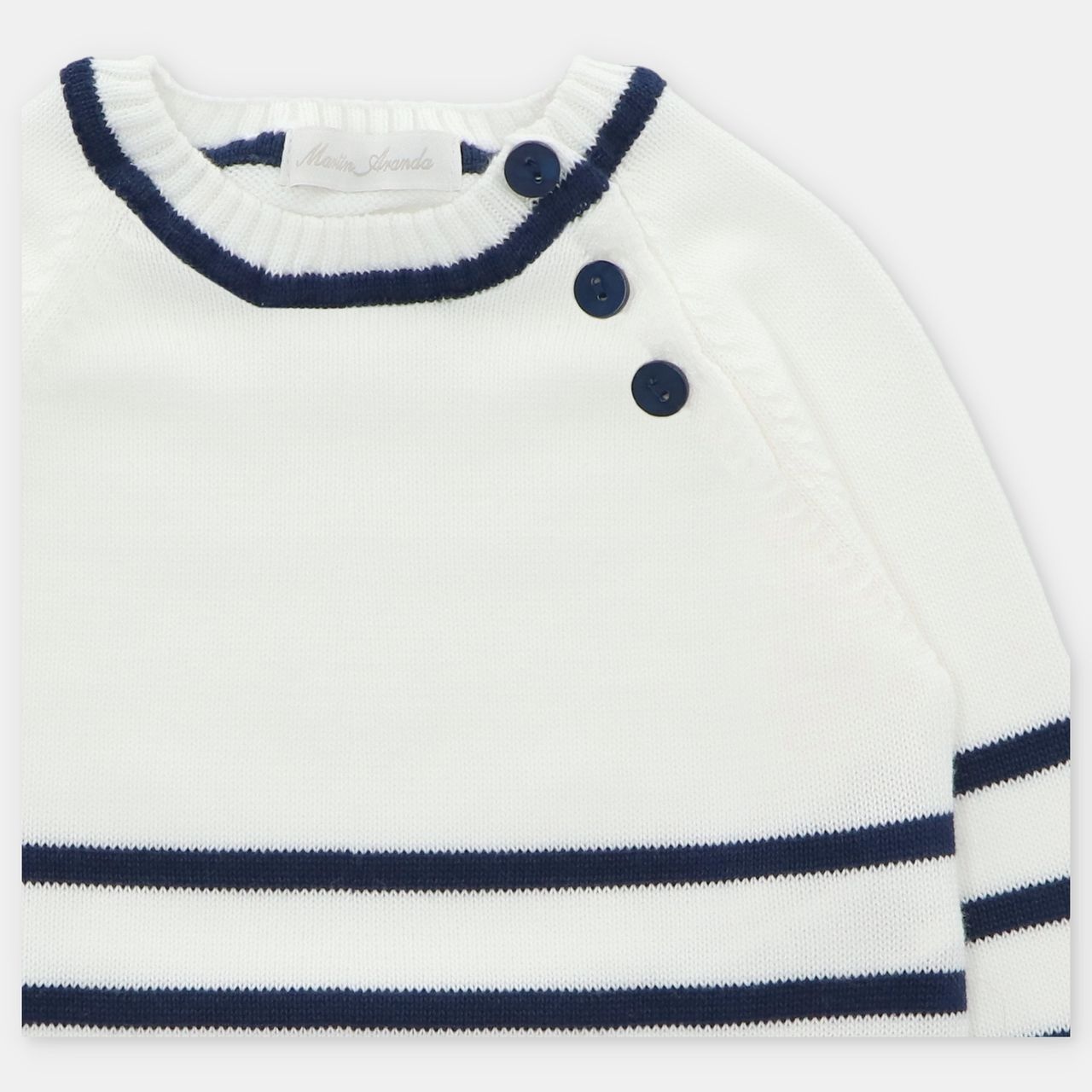 • White pullover with navy stripes and buttonholes on the shoulders.