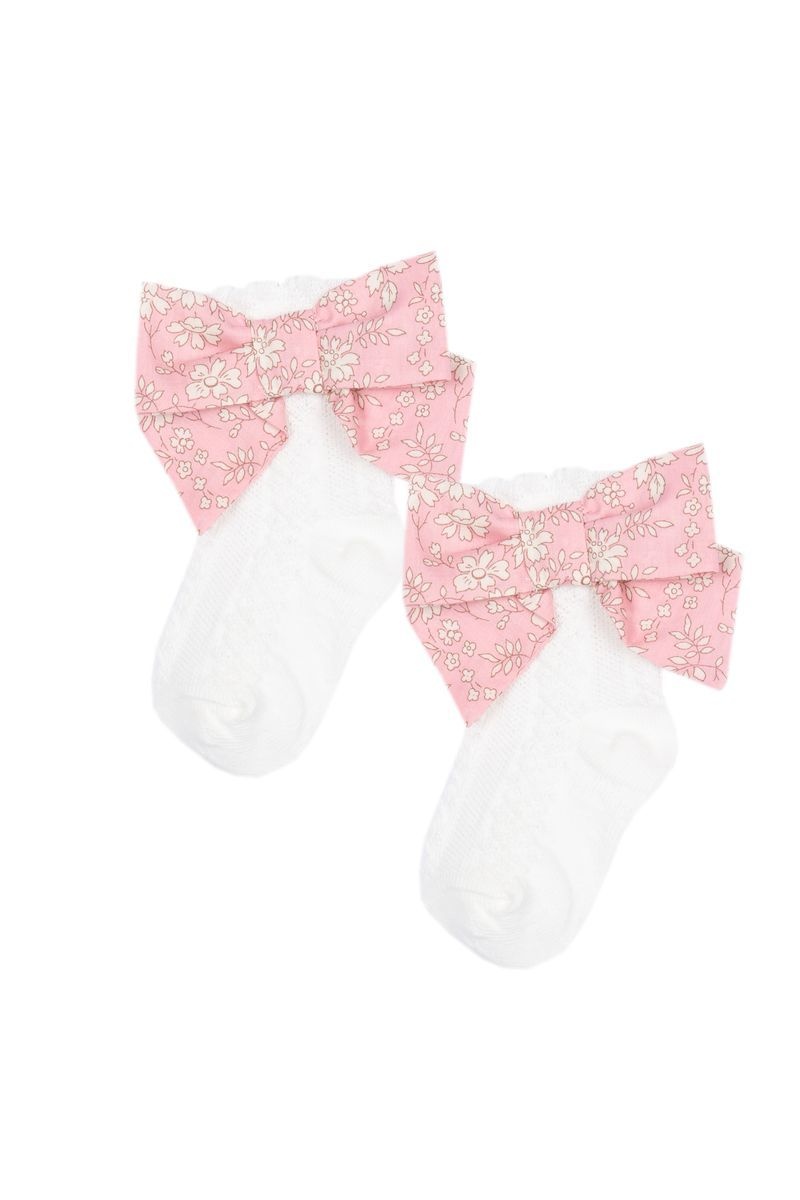 • White socks with decorative pink bows.