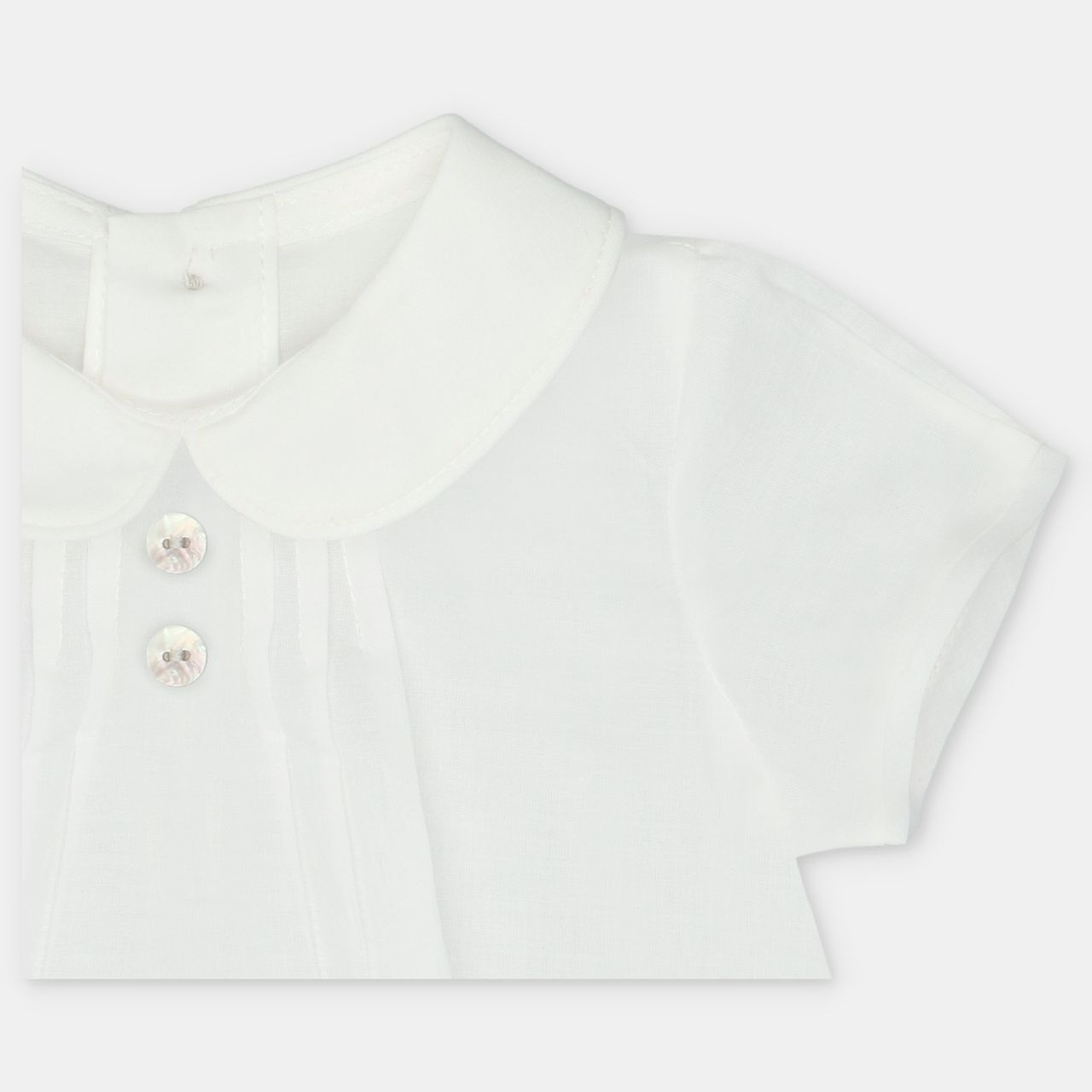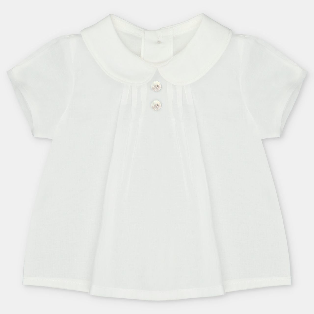 • White short-sleeved shirt with buttonholes on the back.