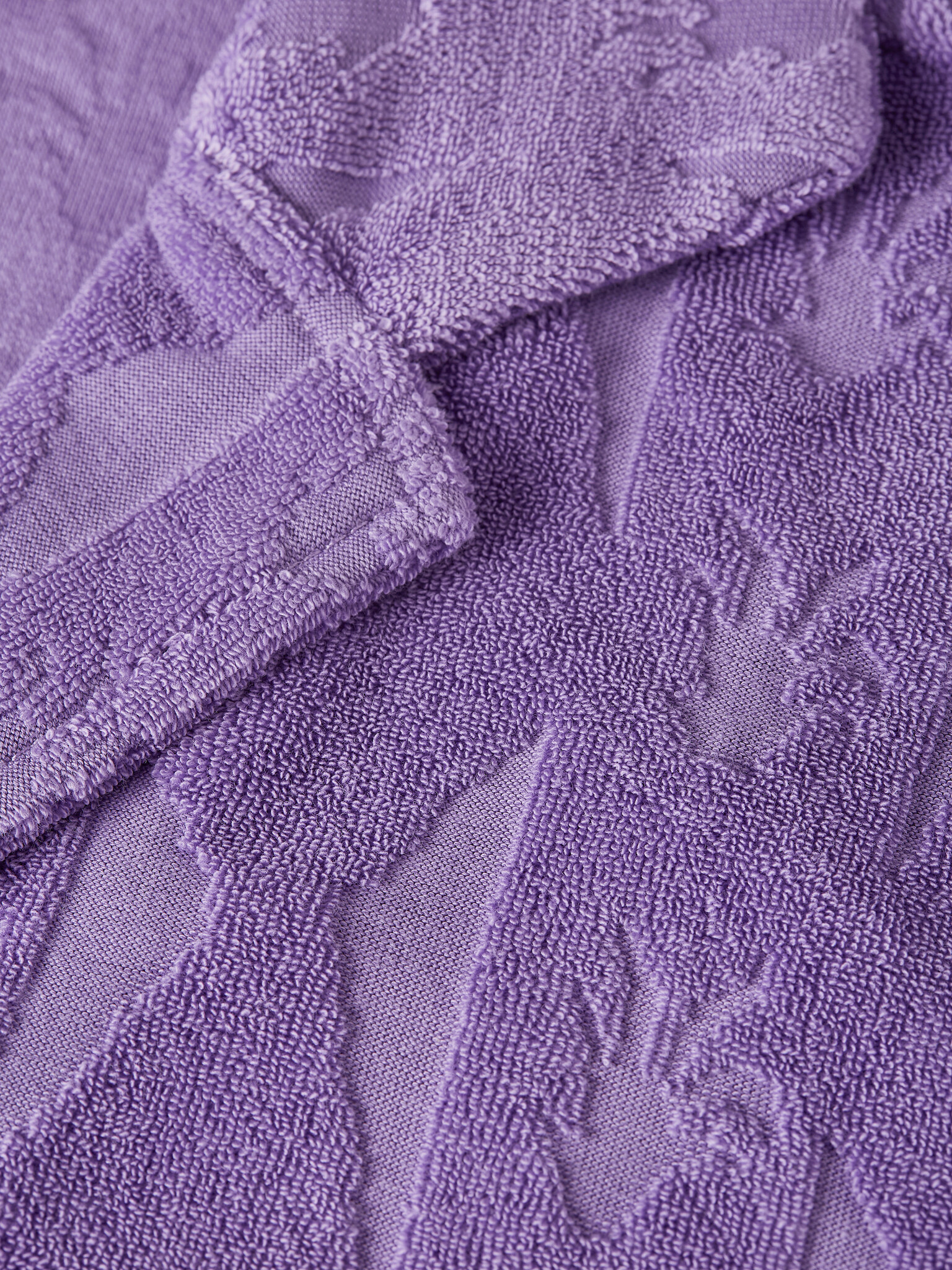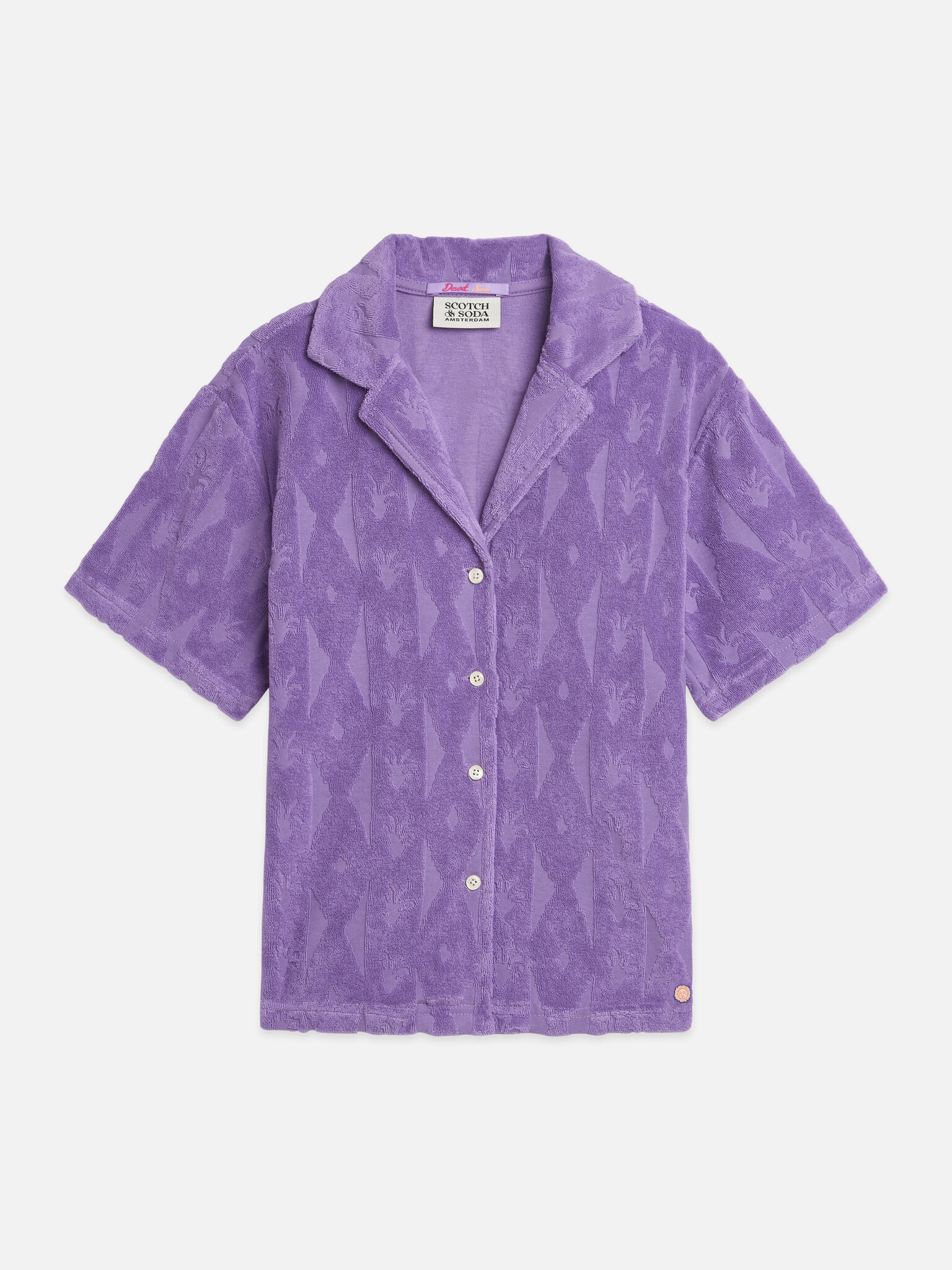 • Mauve terrycloth blouse with button placket and sun patch at the hem.