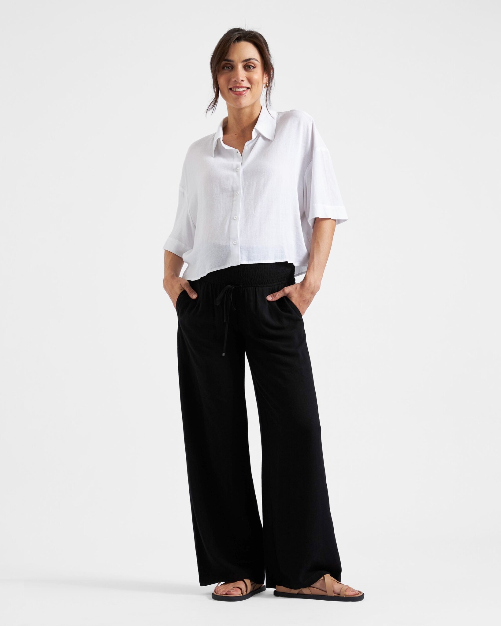• Short-sleeved white crop shirt.