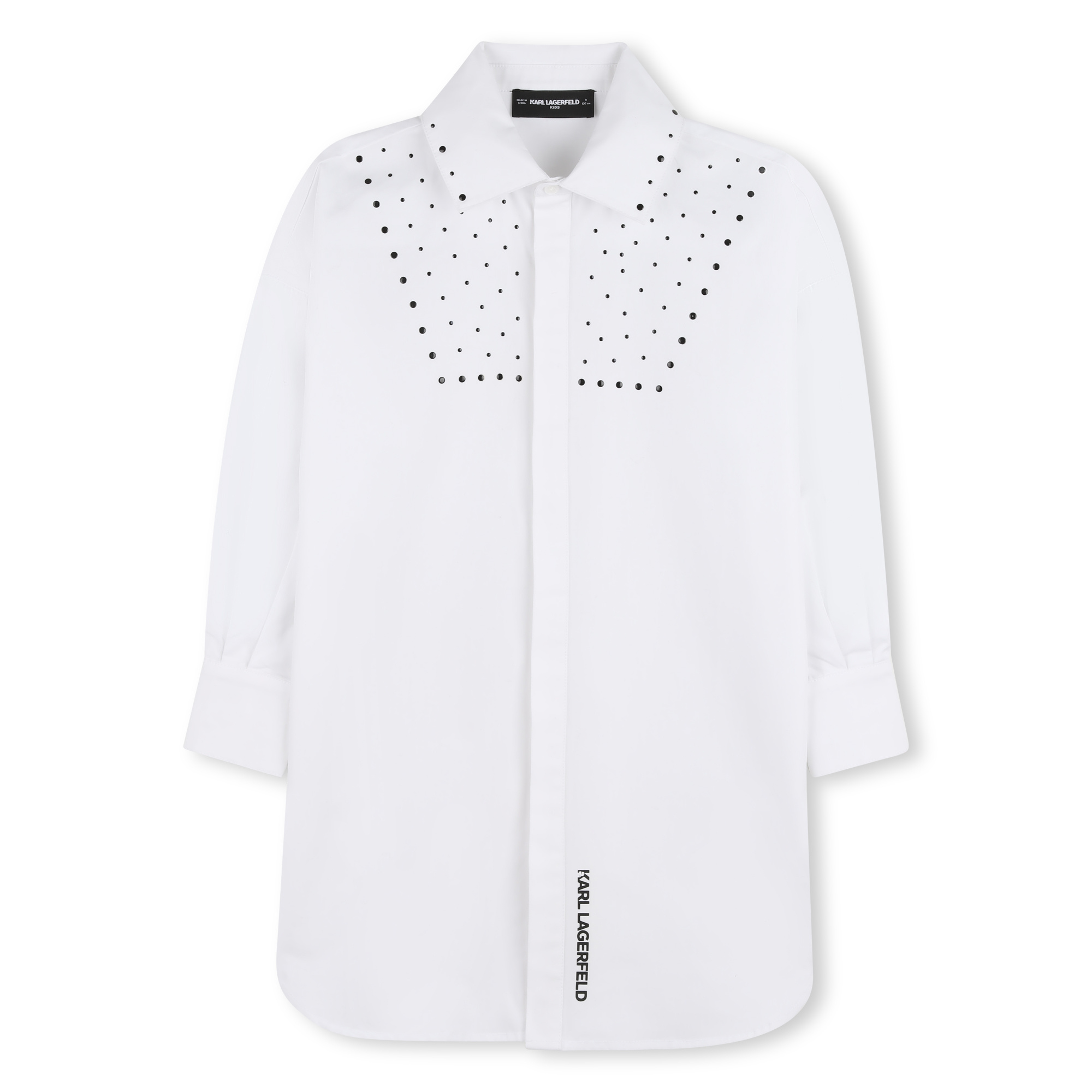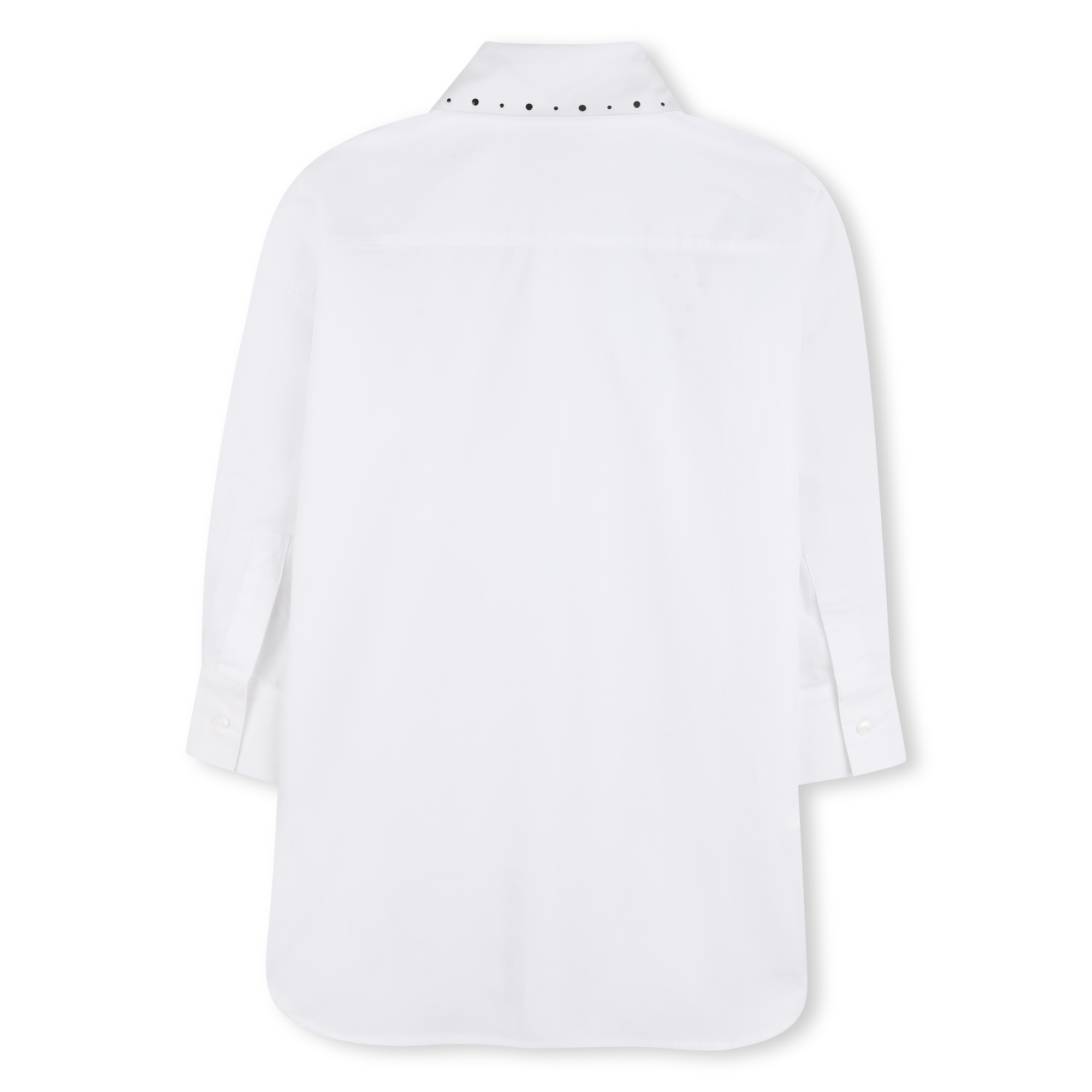 White sleeveless denim-style dress with small black studded details on the front and collar. Pockets at the front and sides. Zip fastening.