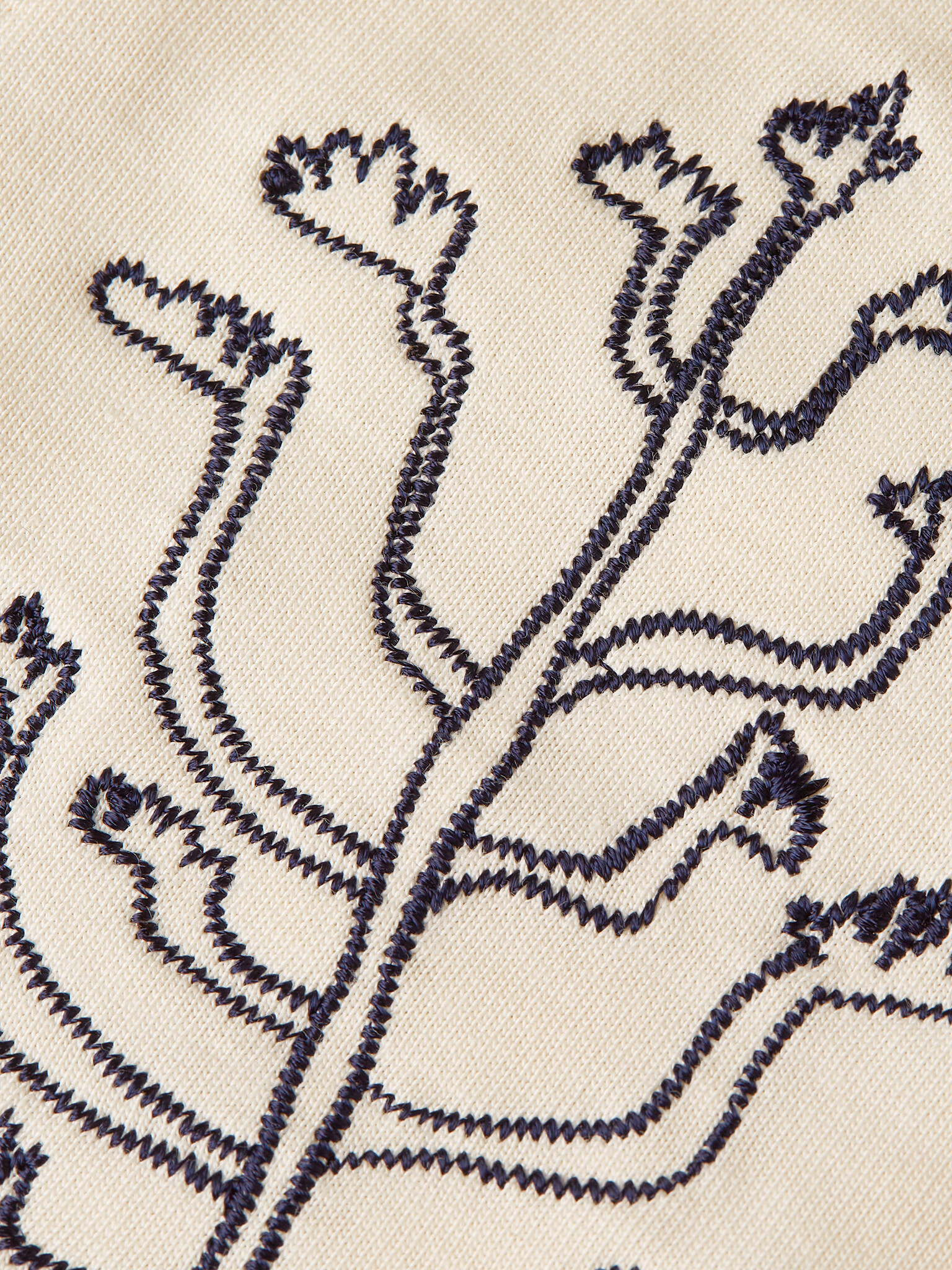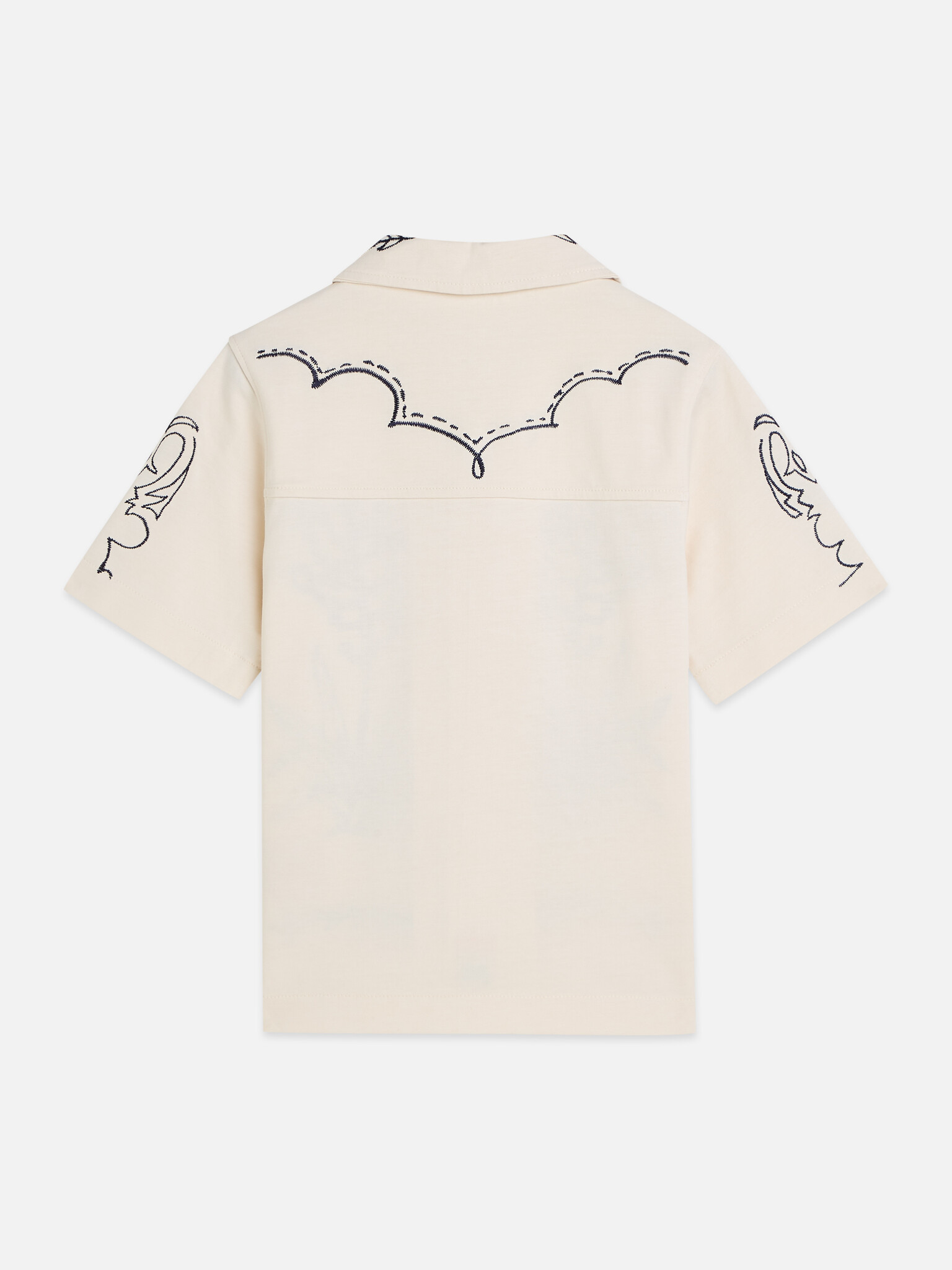 • Cream short-sleeved blouse with black woven details and button placket.