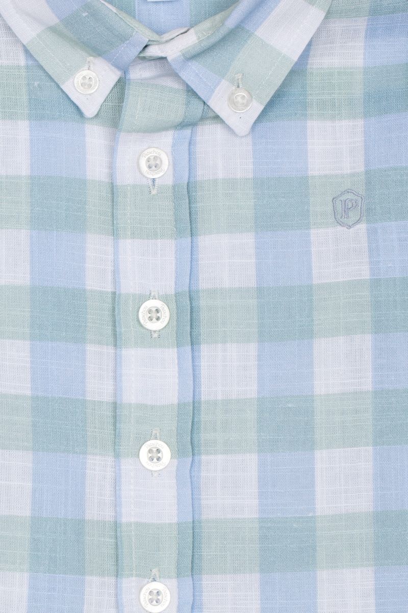 • Blue plaid shirt with long sleeves.