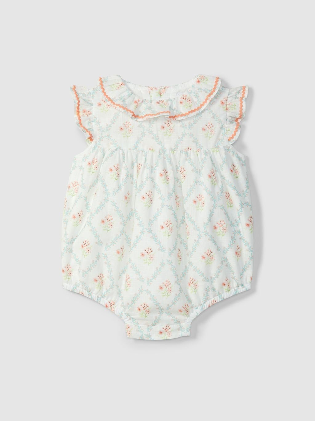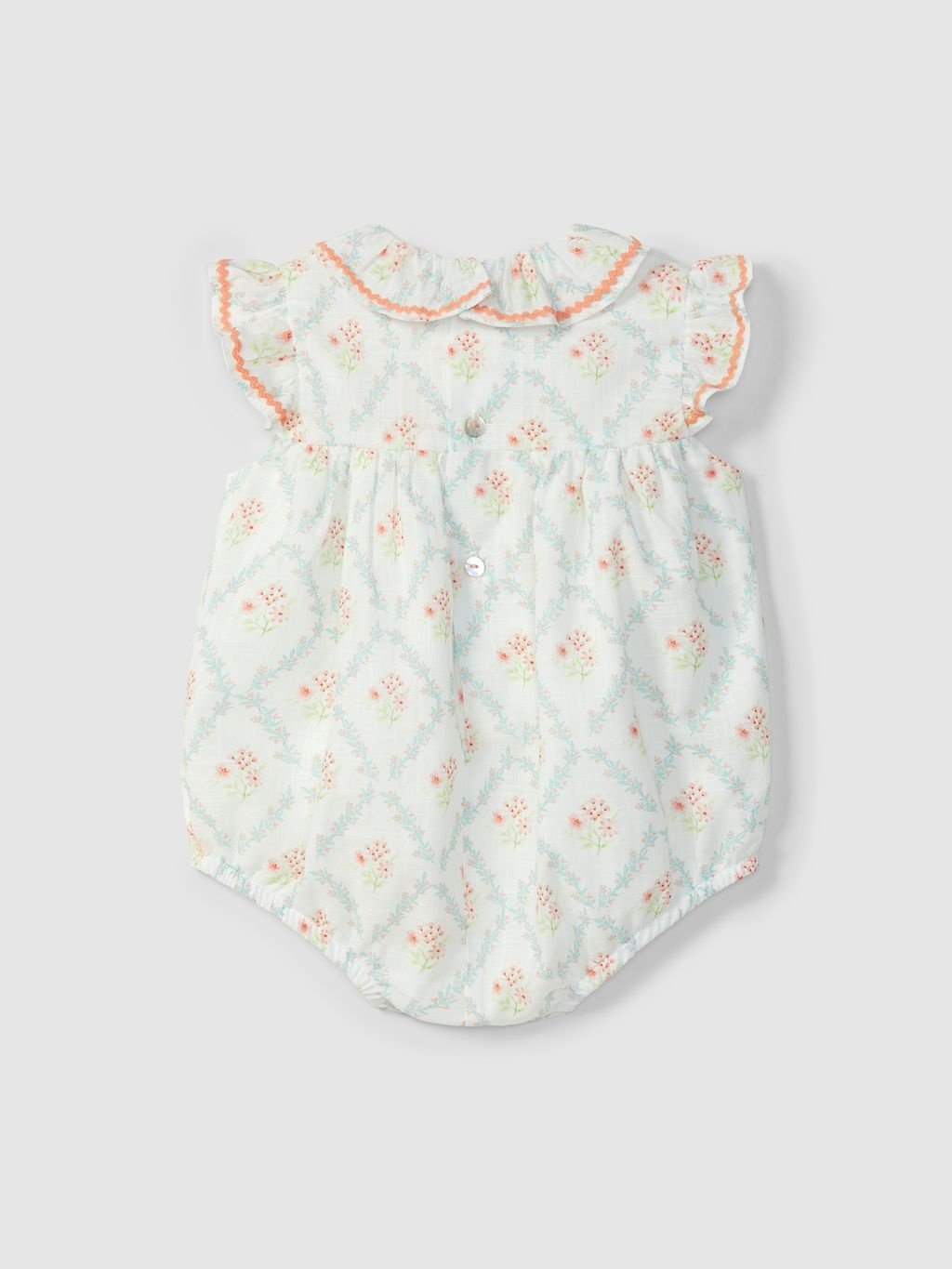 • Floral romper with buttonholes at the back and snap buttons at the crotch.
