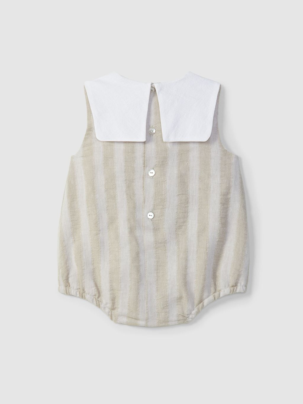 • Beige romper with buttonholes at the back and snap buttons at the crotch.