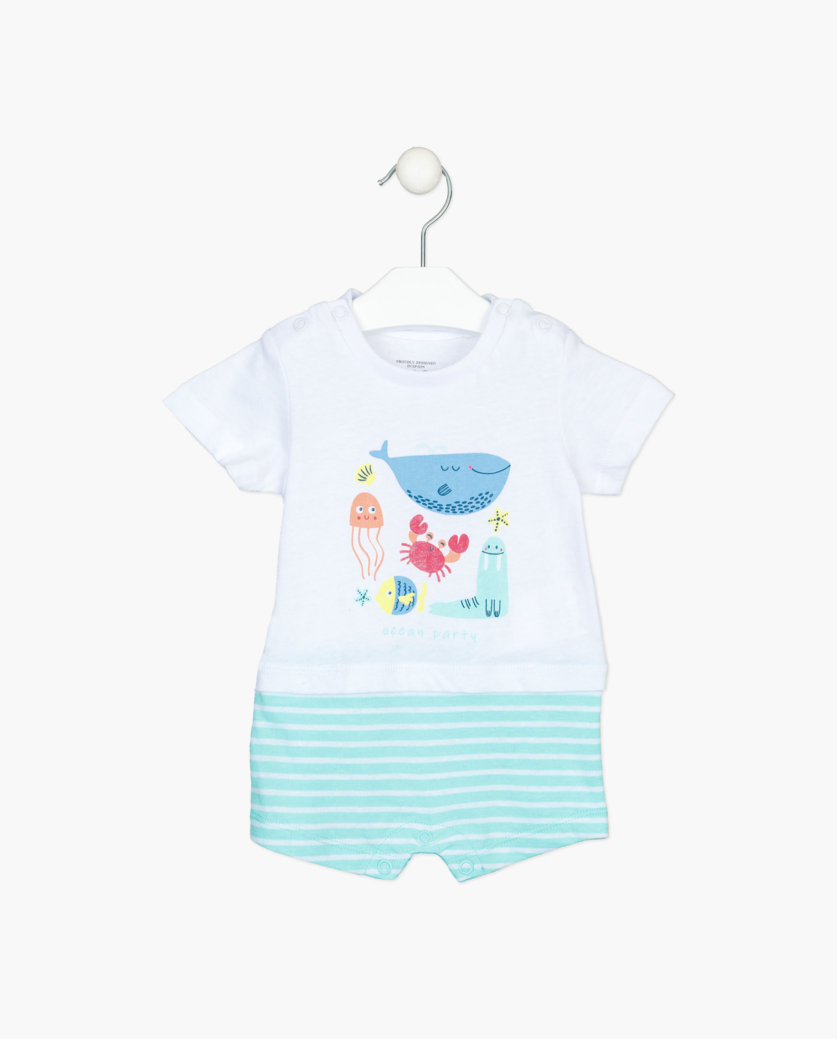 • White and turquoise printed short suit.