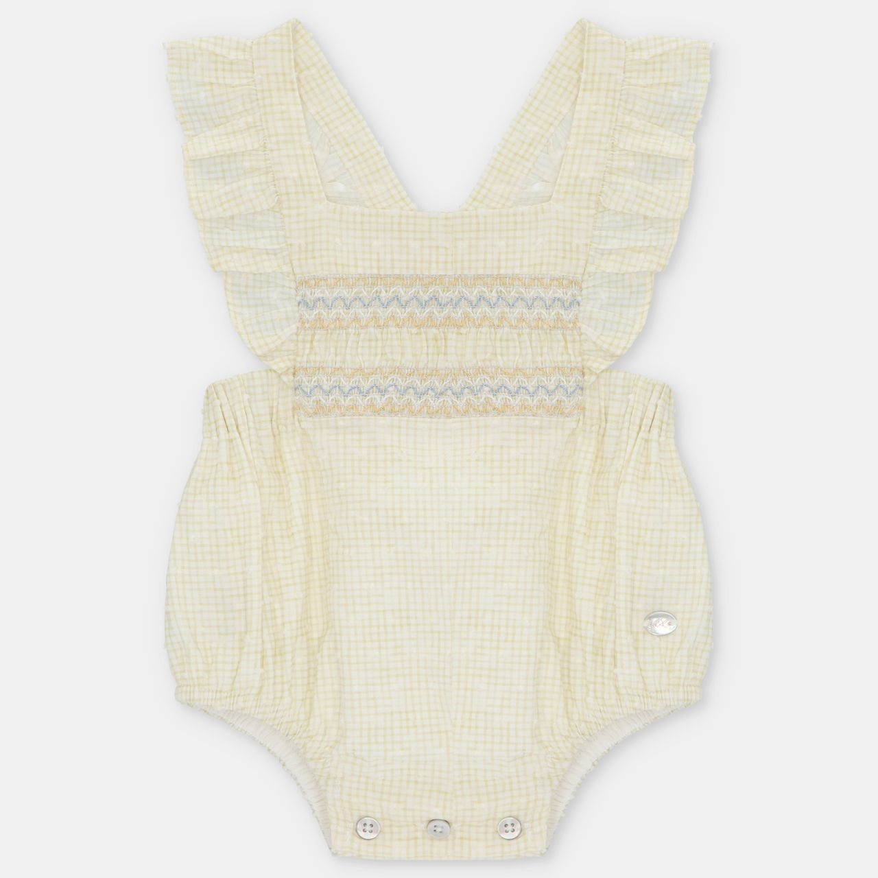 • Yellow plaid romper with buttonholes at the crotch.
