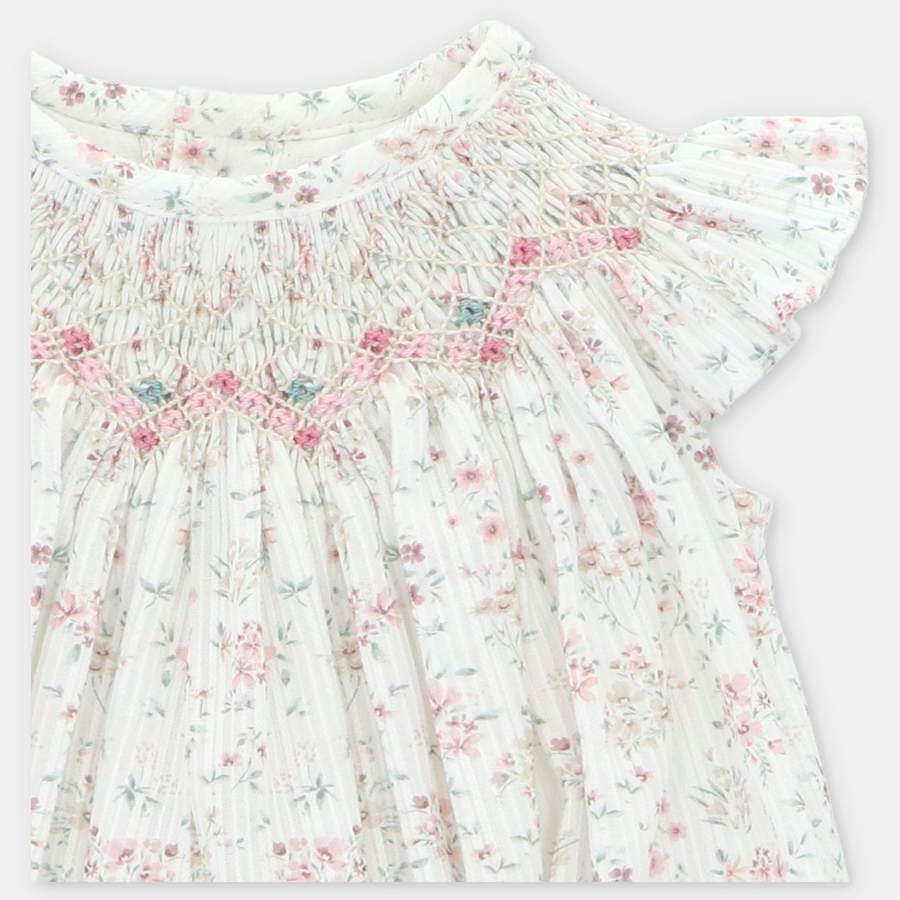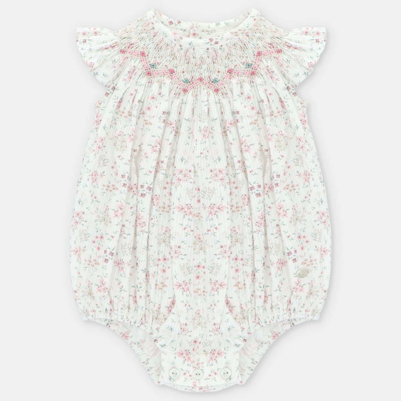 • Floral print romper with buttonholes at the back and crotch.