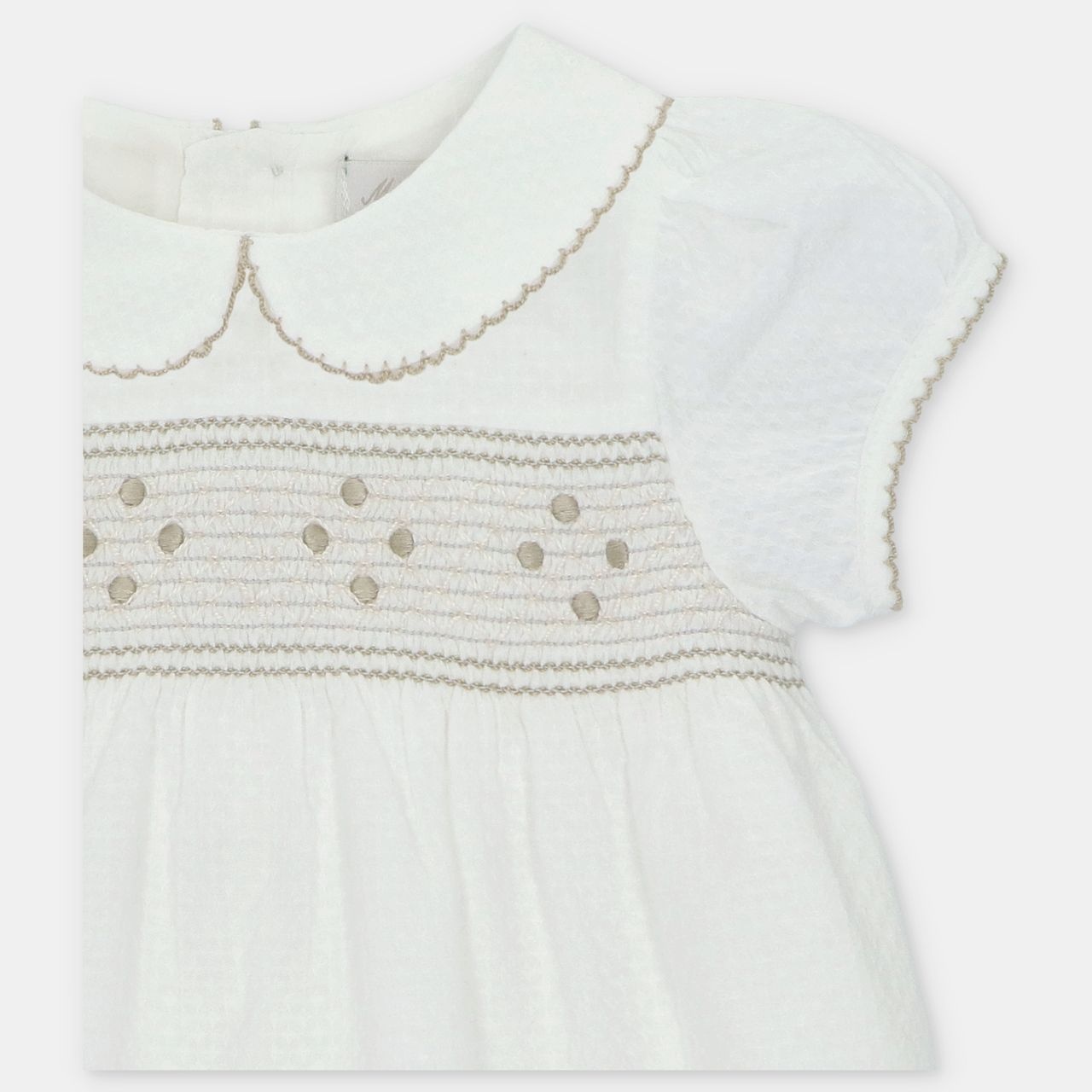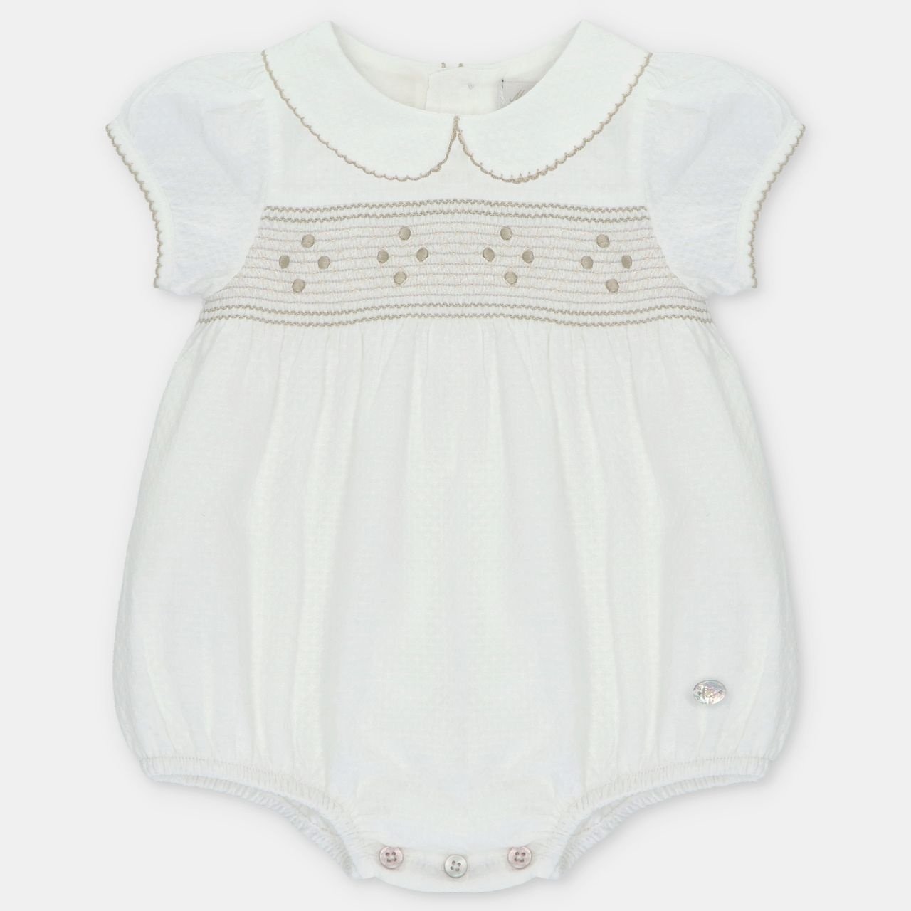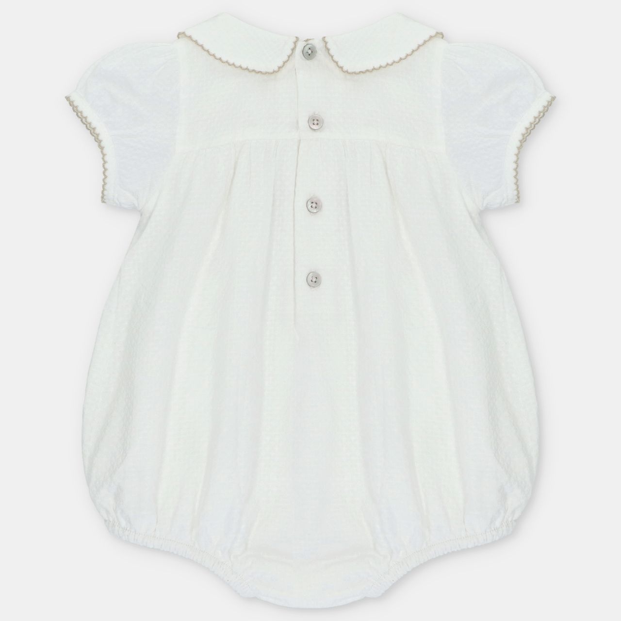 • White romper with pretty collar buttoned at the back and crotch.