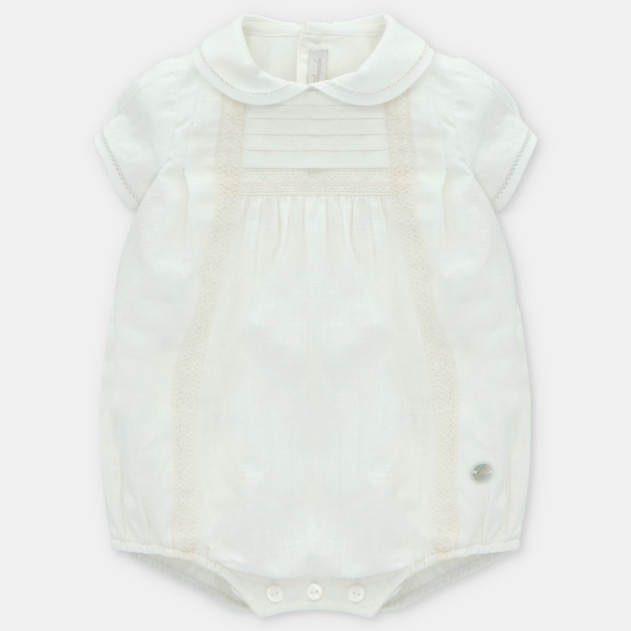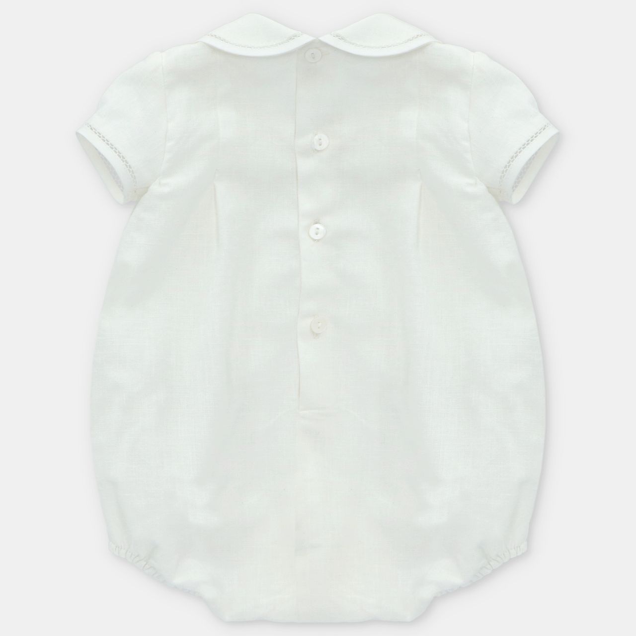 • White romper with buttonholes at the back and crotch.