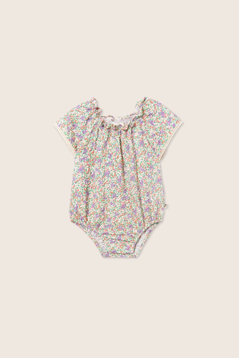 • Floral romper with snap buttons at the crotch.