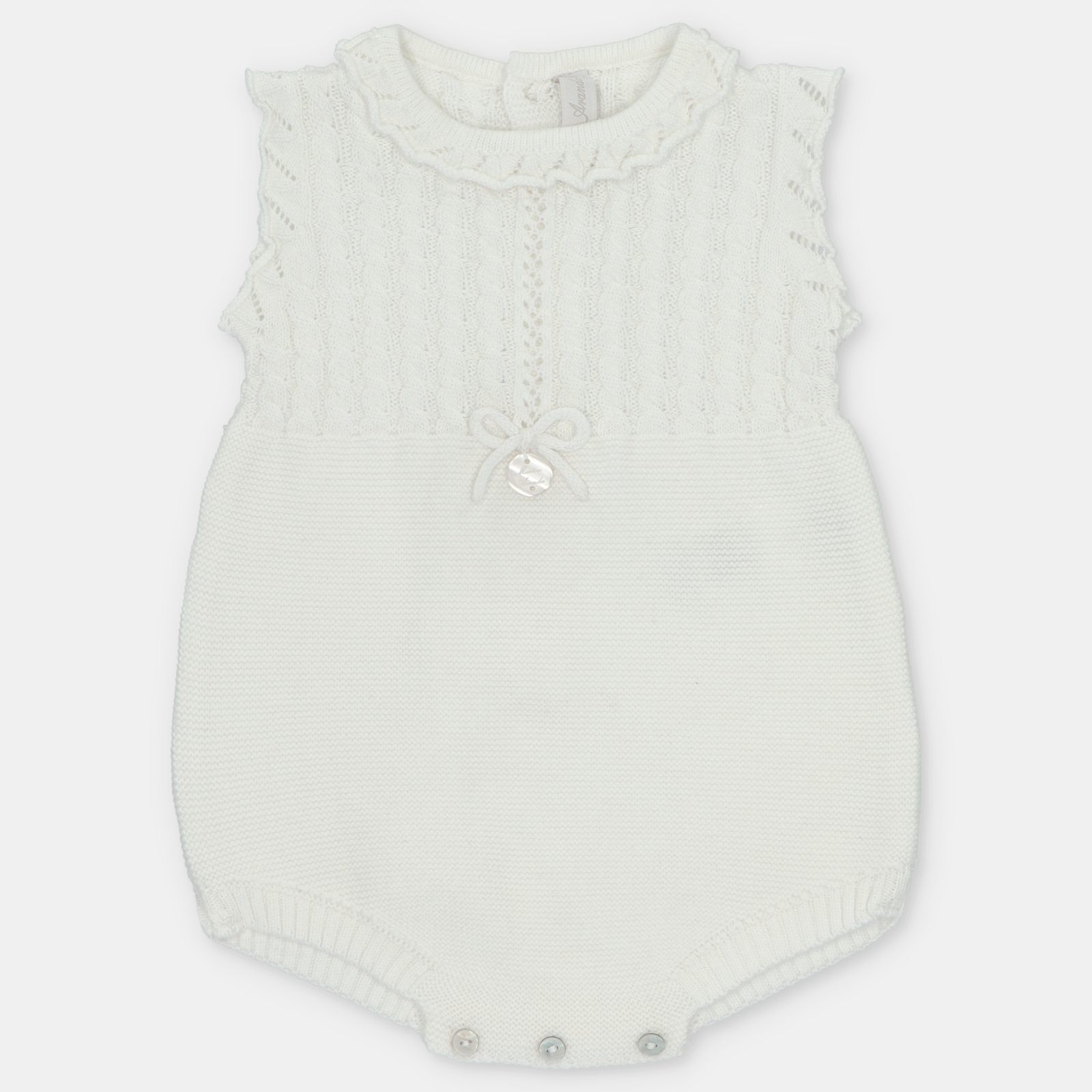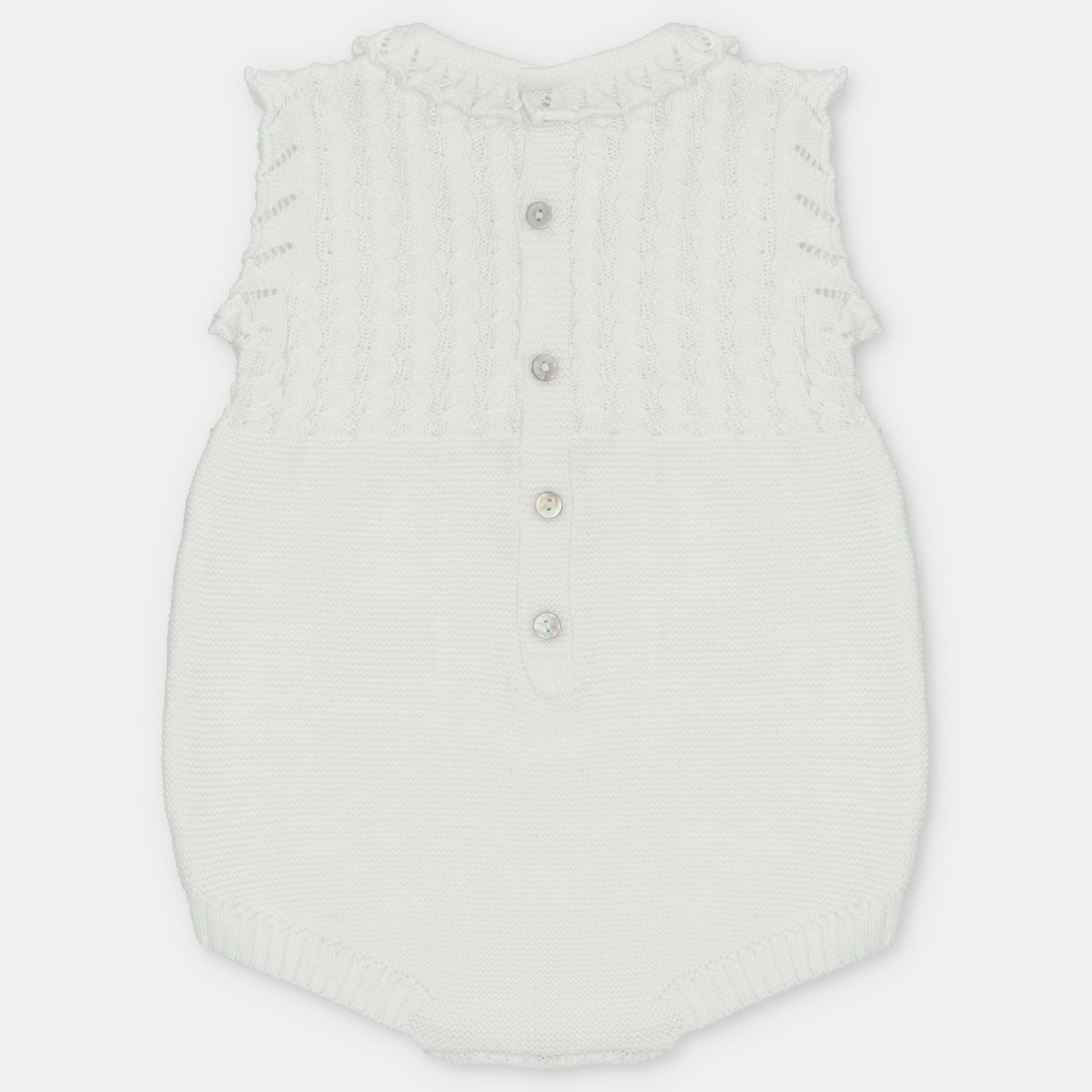 • White knit romper with buttonholes at the back and crotch.