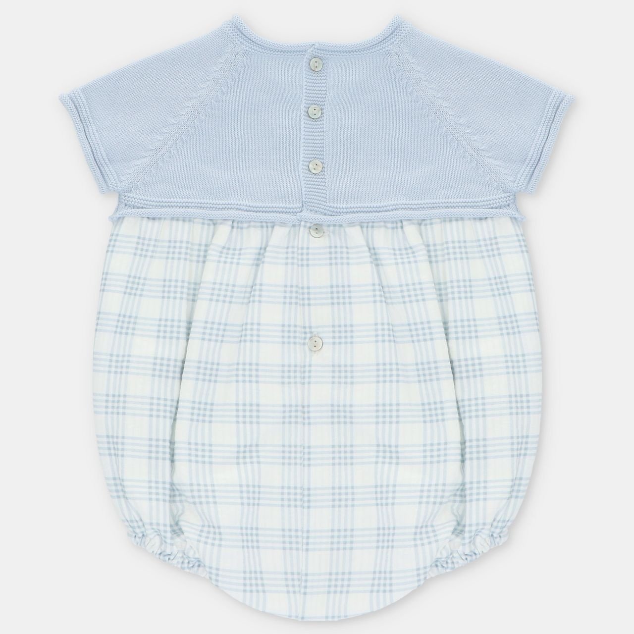 • Blue and white romper with knitted top and button fastenings at the back and crotch.