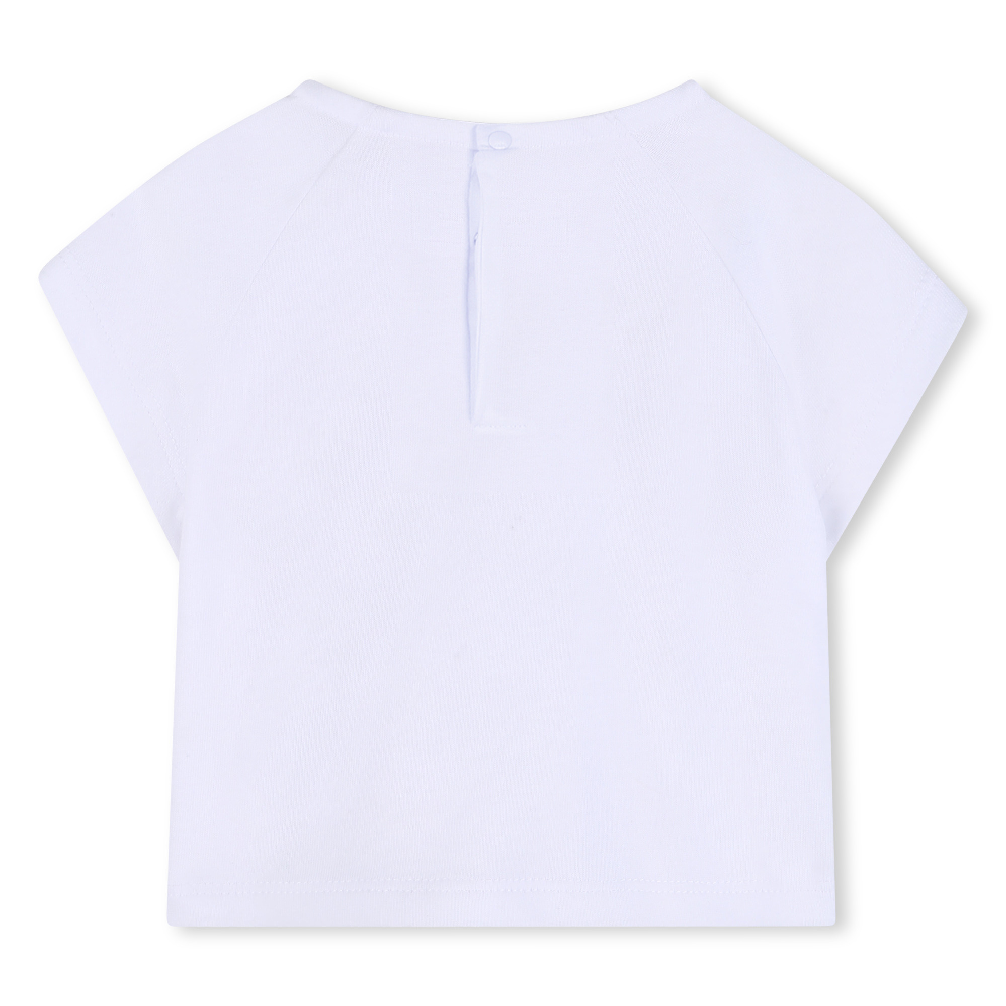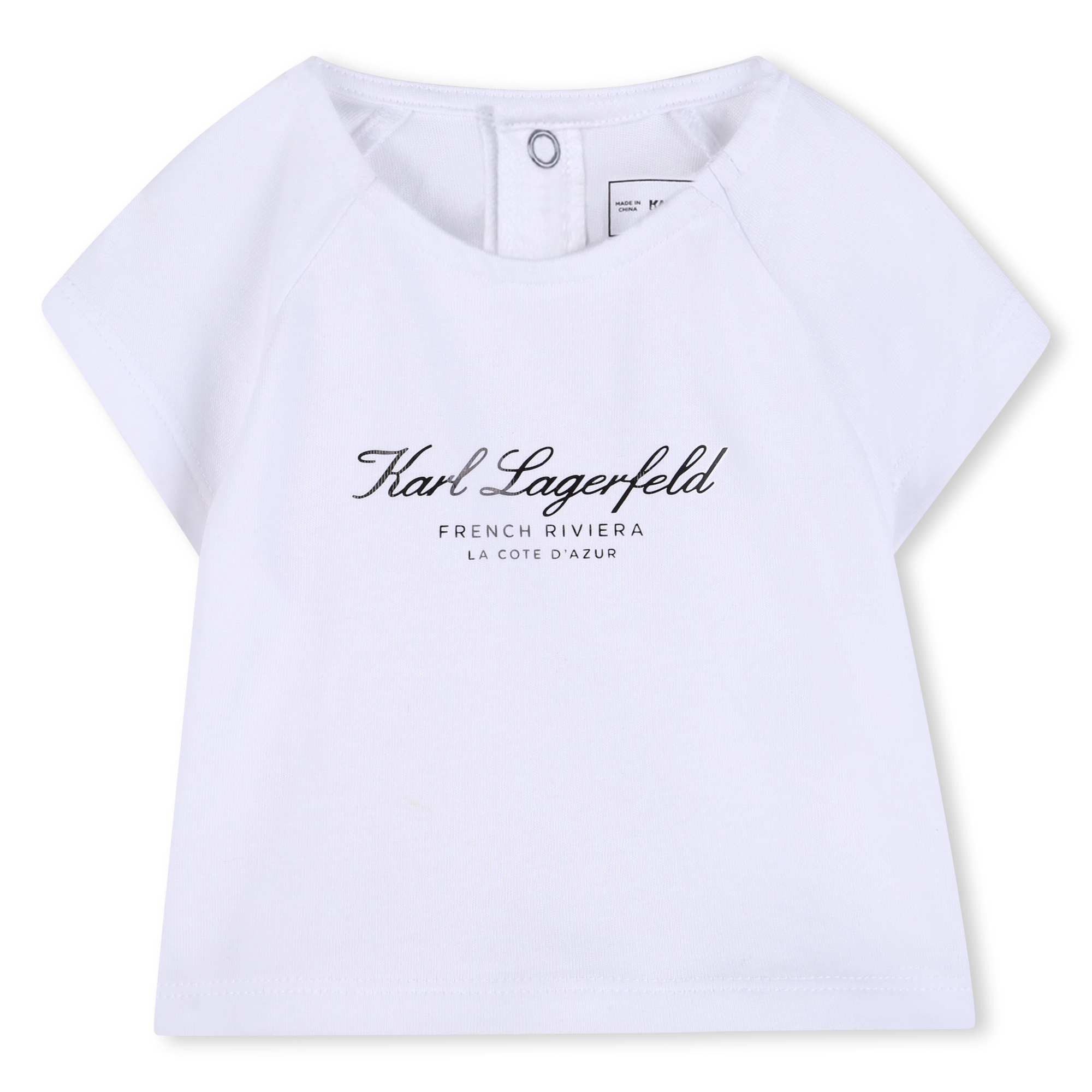 Two-piece set: black and white striped t-shirt with a pink kitten and snap button at the back. Elasticated waist skirt with two side pockets.