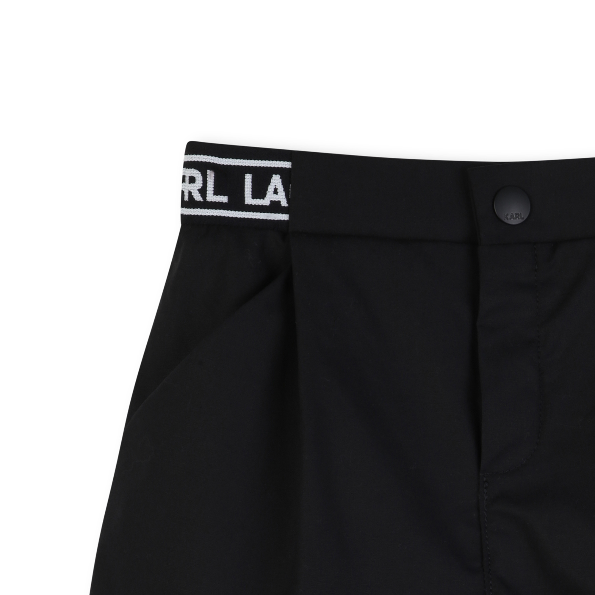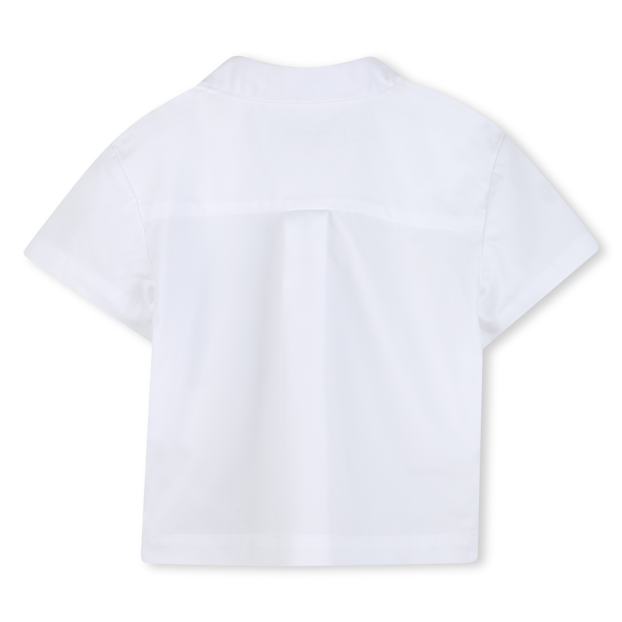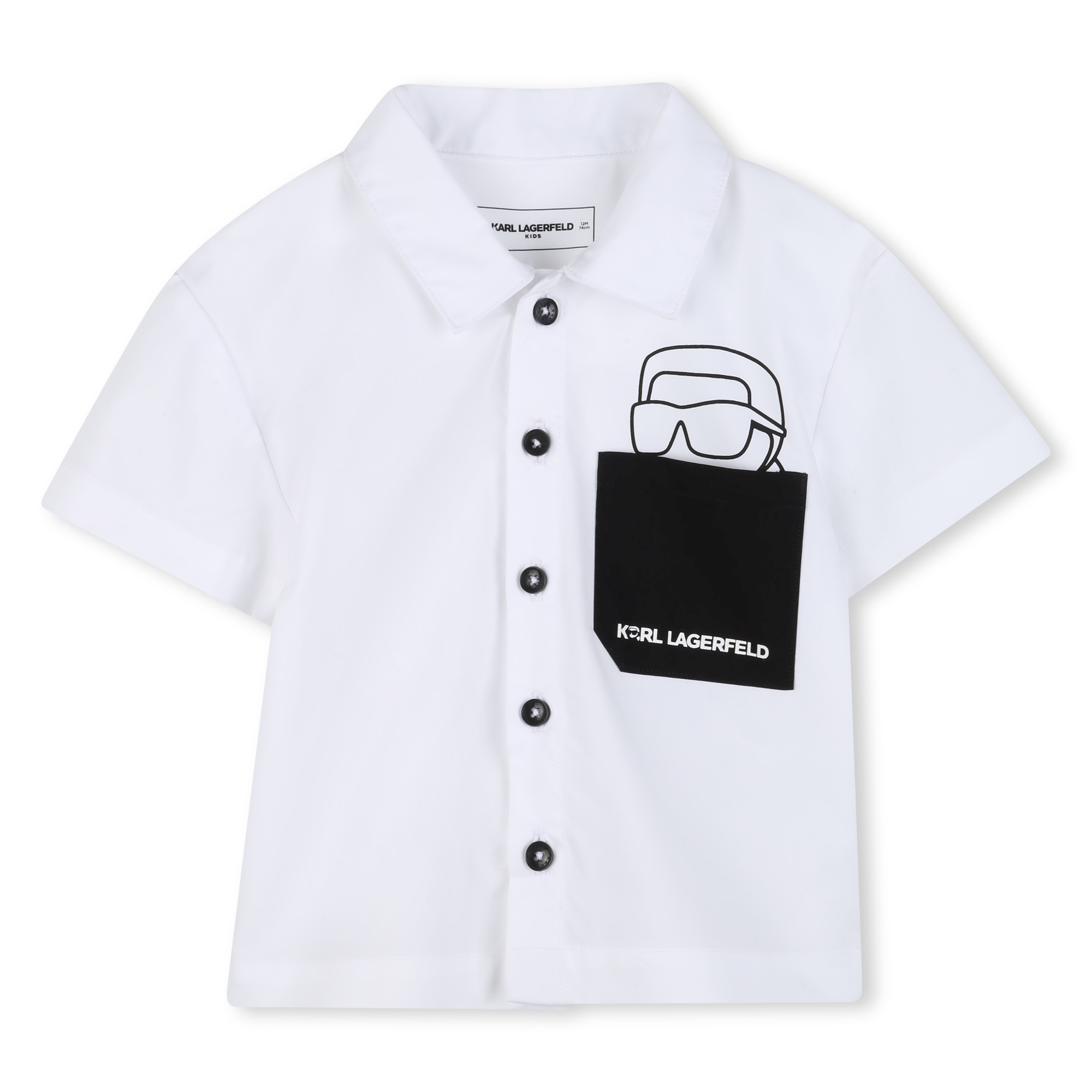 • Two-piece set: white blouse with black pocket square and button placket, and black dress pants with snap button closure and elasticated waistband.