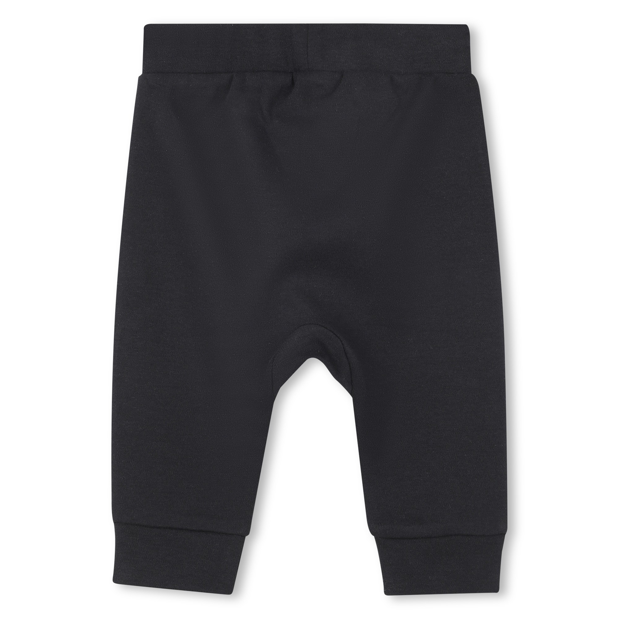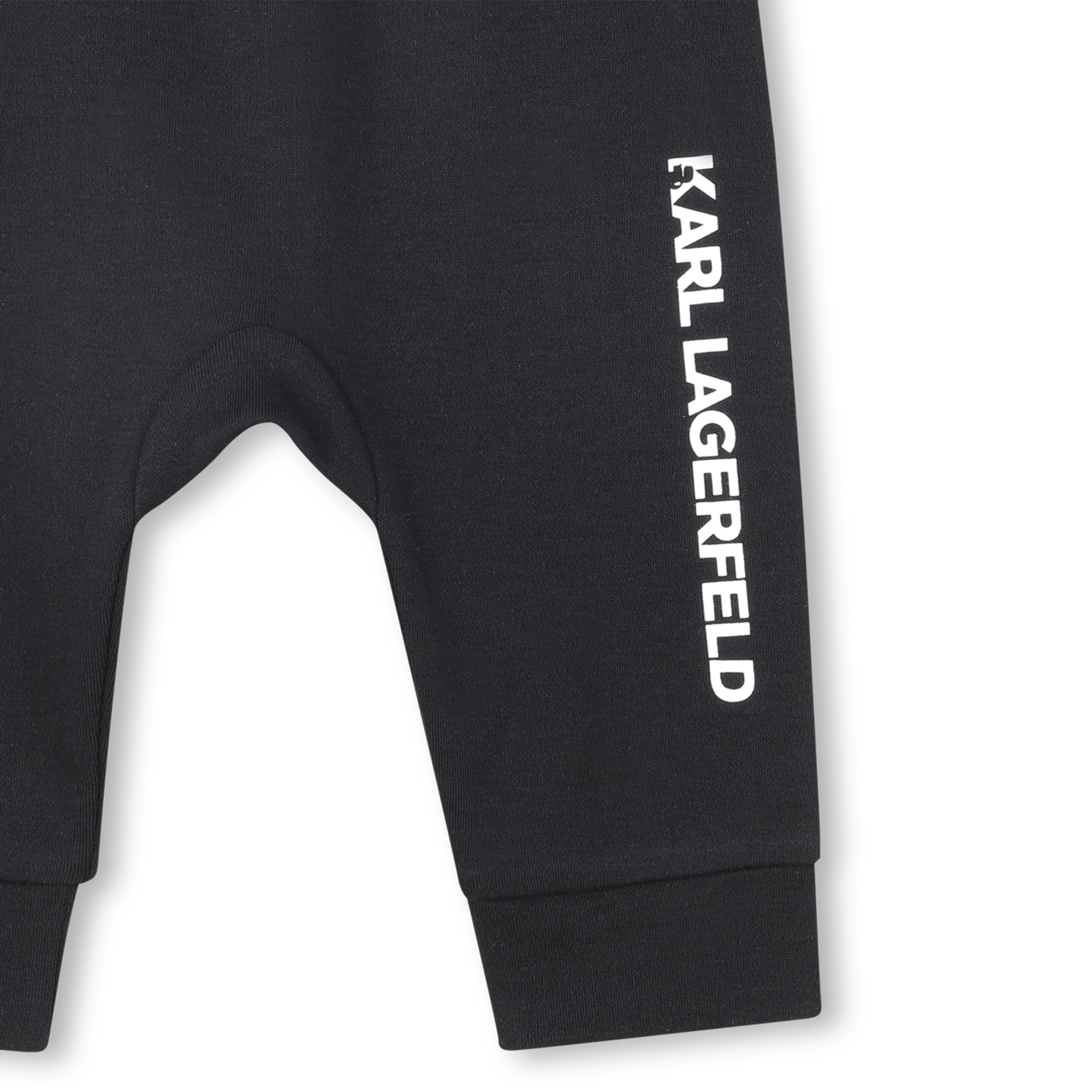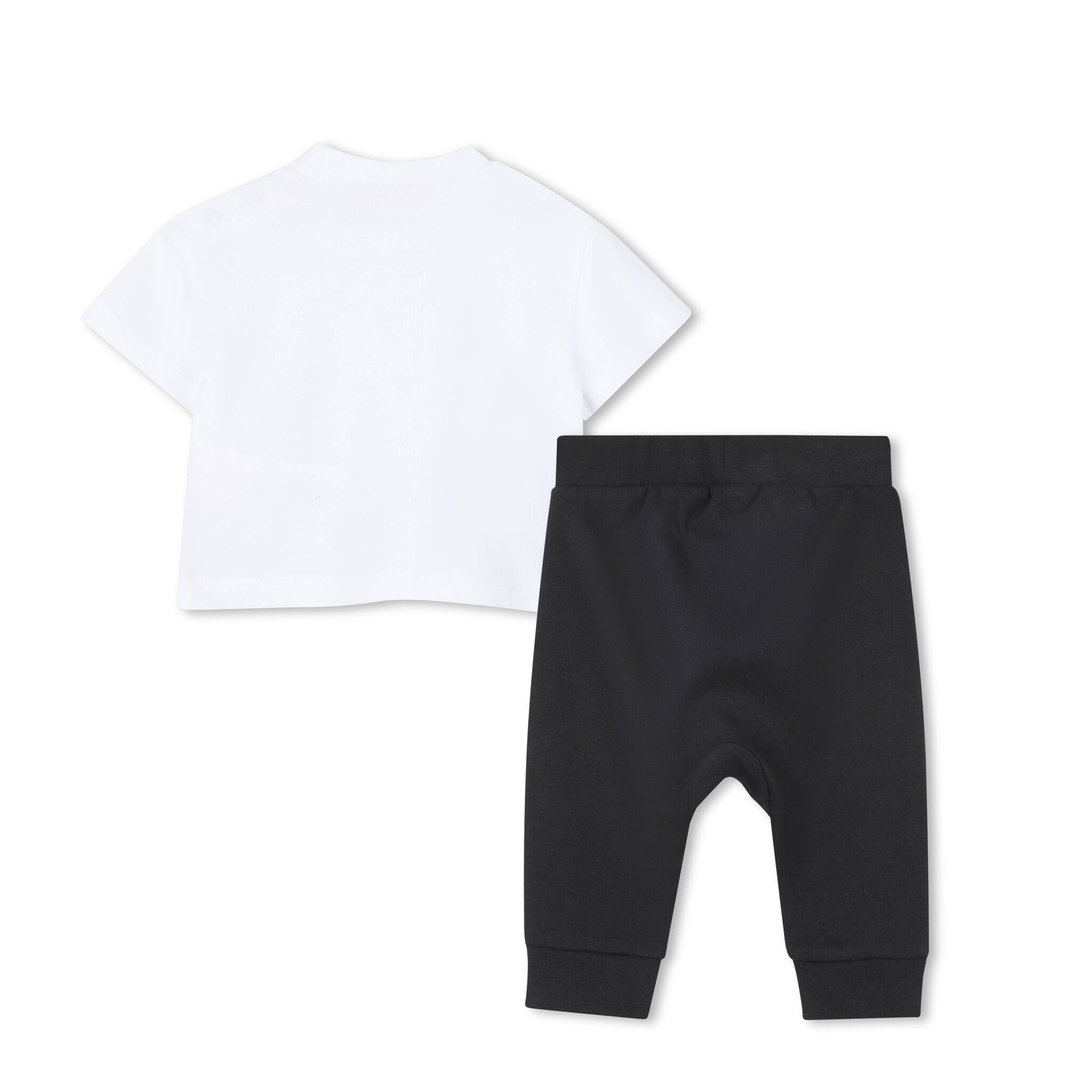 Two-piece set: Light blue T-shirt with snap buttons at the back, a colorful detail on the shoulders, and a logo on the front. Navy and white striped shorts with side pockets. Elasticated waist.