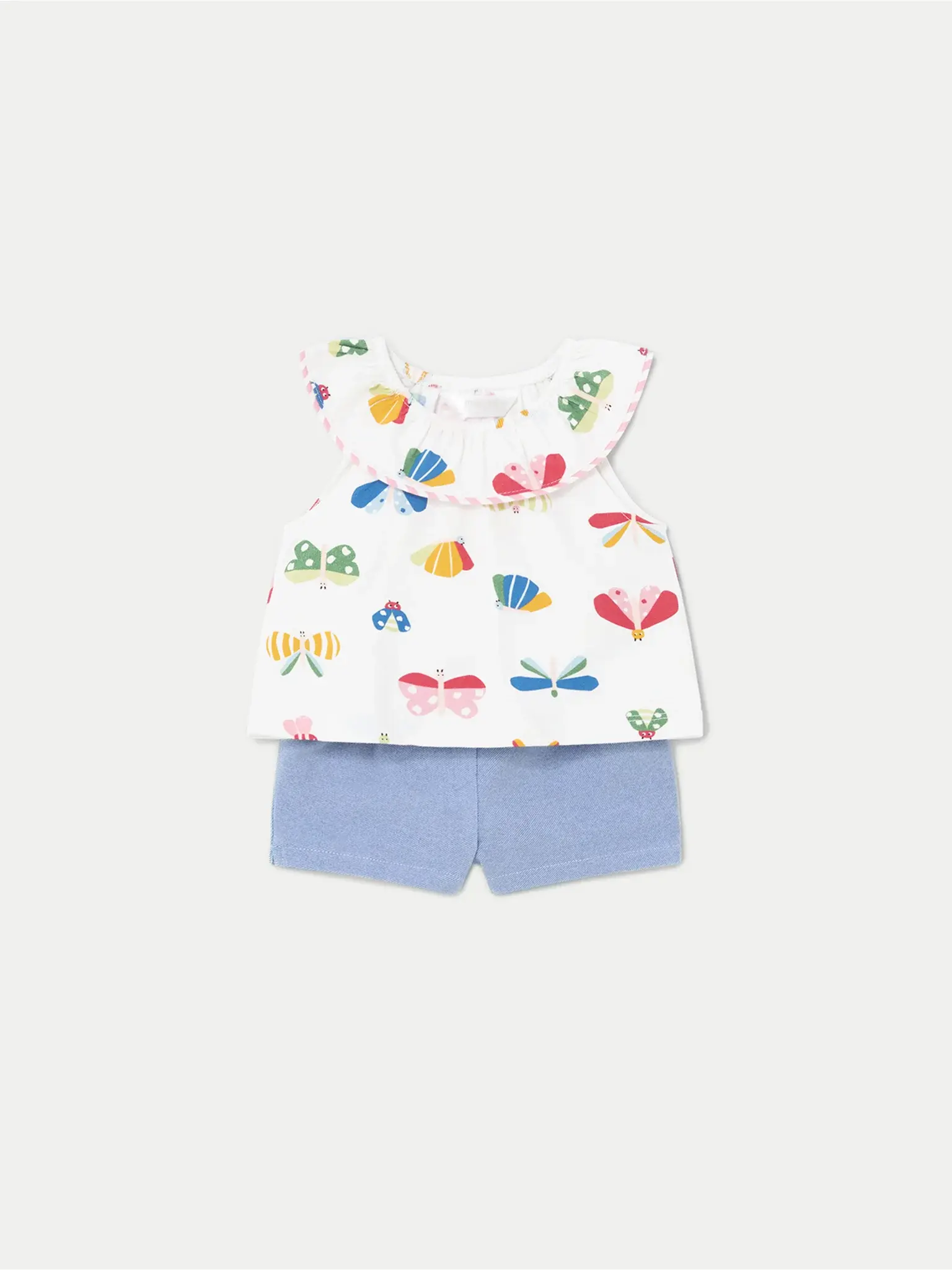 • 2-piece set including a white printed top and blue shorts.