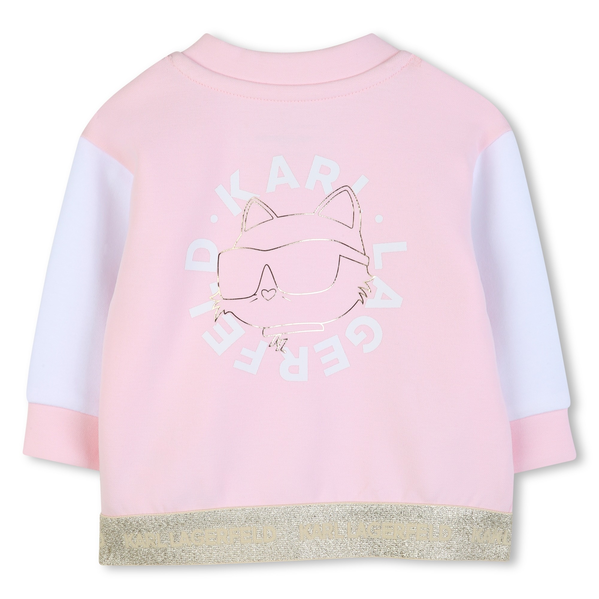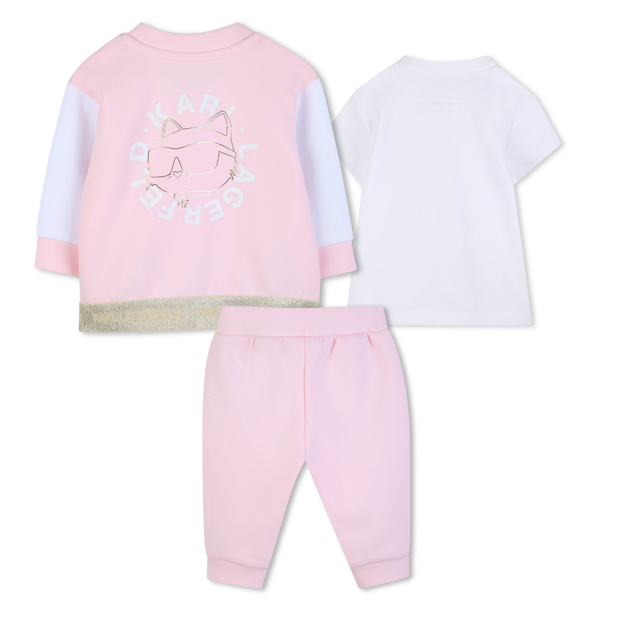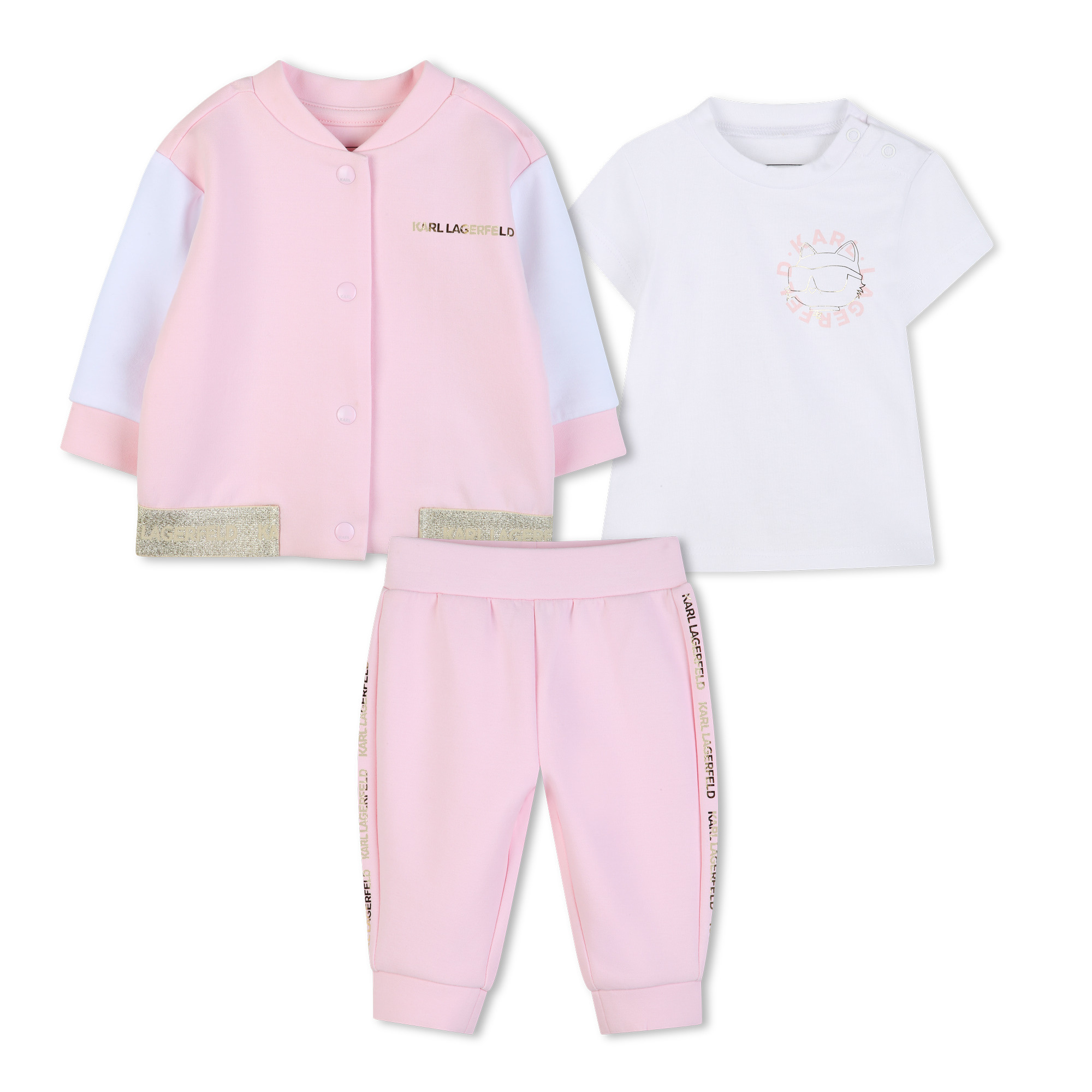 3-piece set: White T-shirt with a kitten print and snap buttons on the left shoulder, pink jacket with a gold print on the back and a black zipper, and pink dress pants with gold buttons and an elasticated waistband.