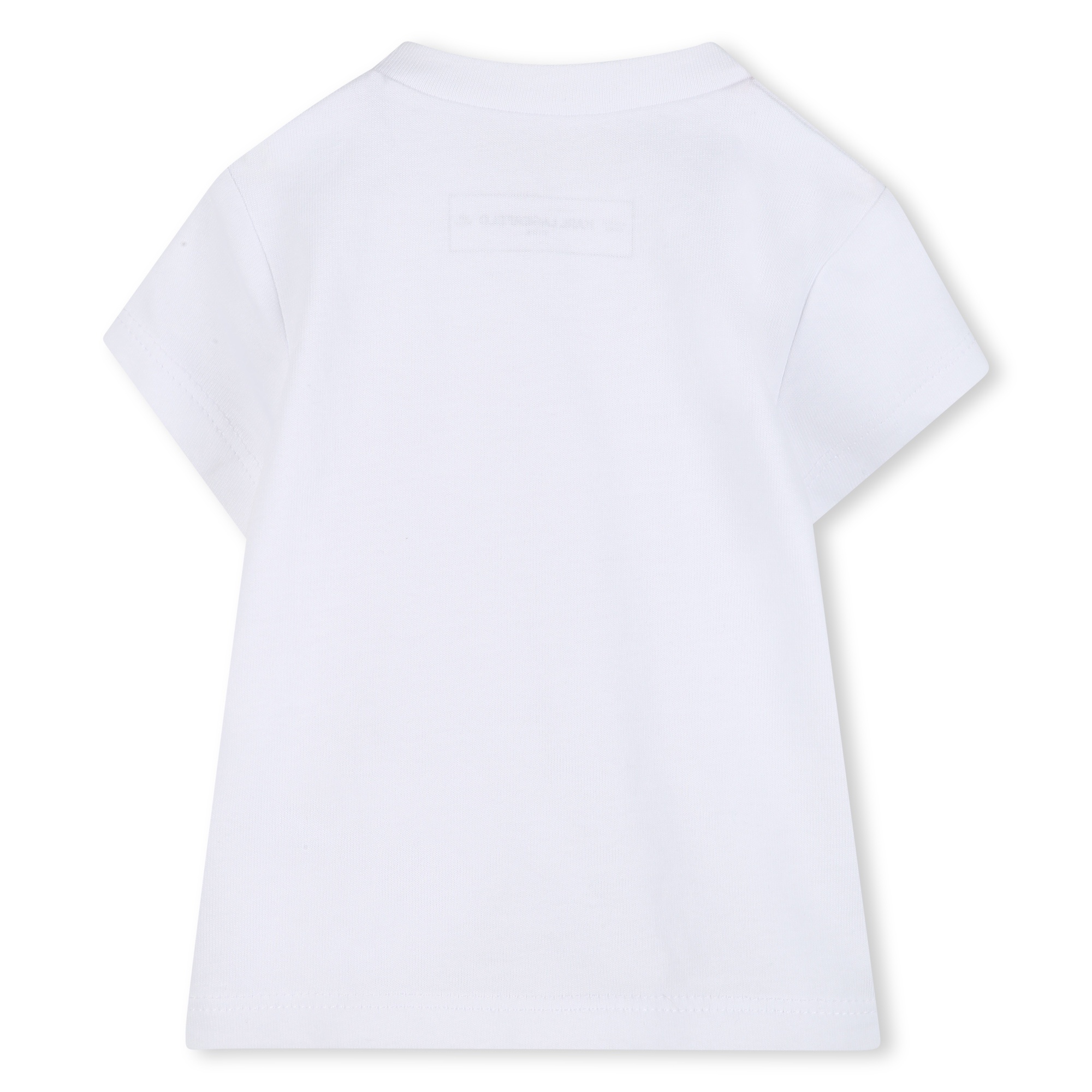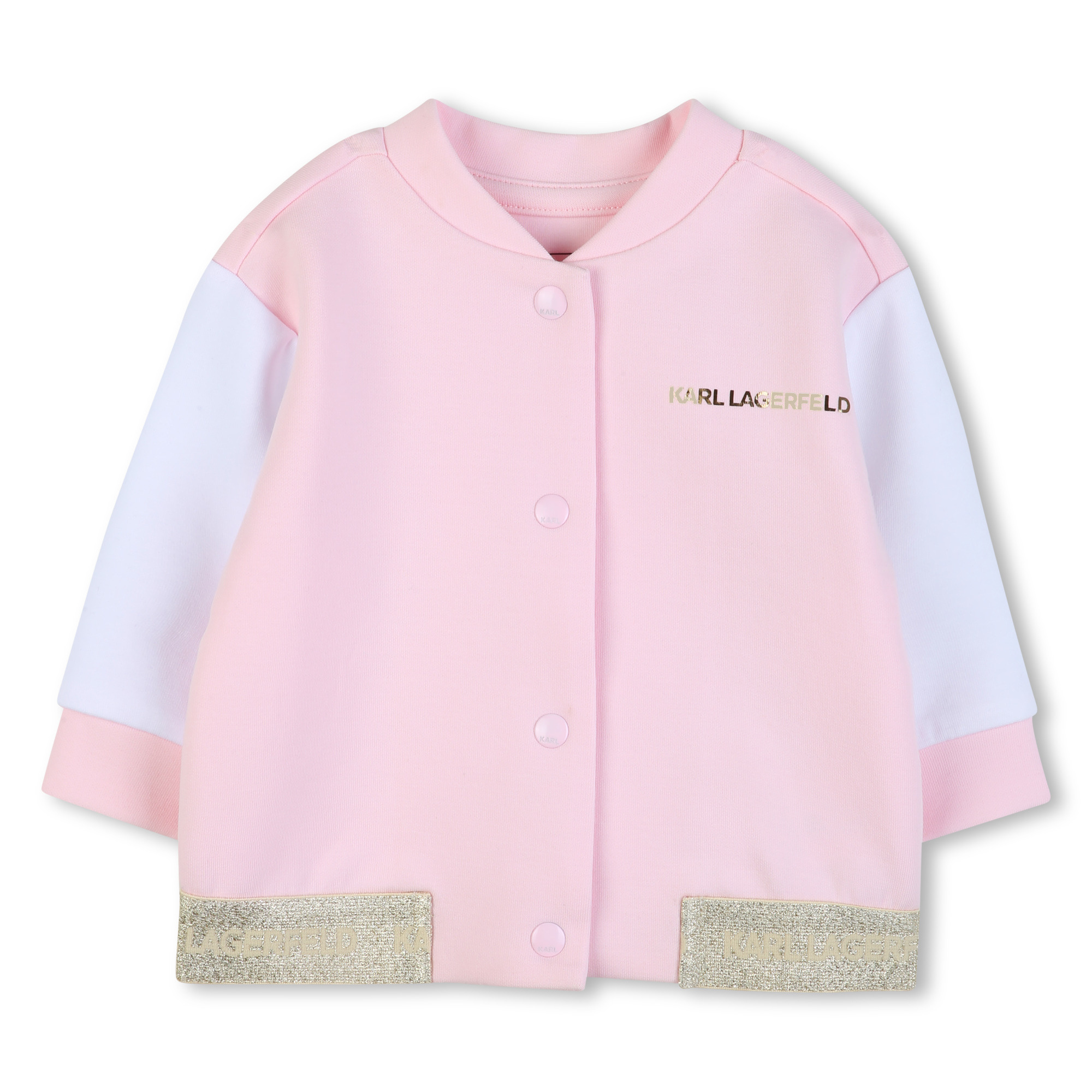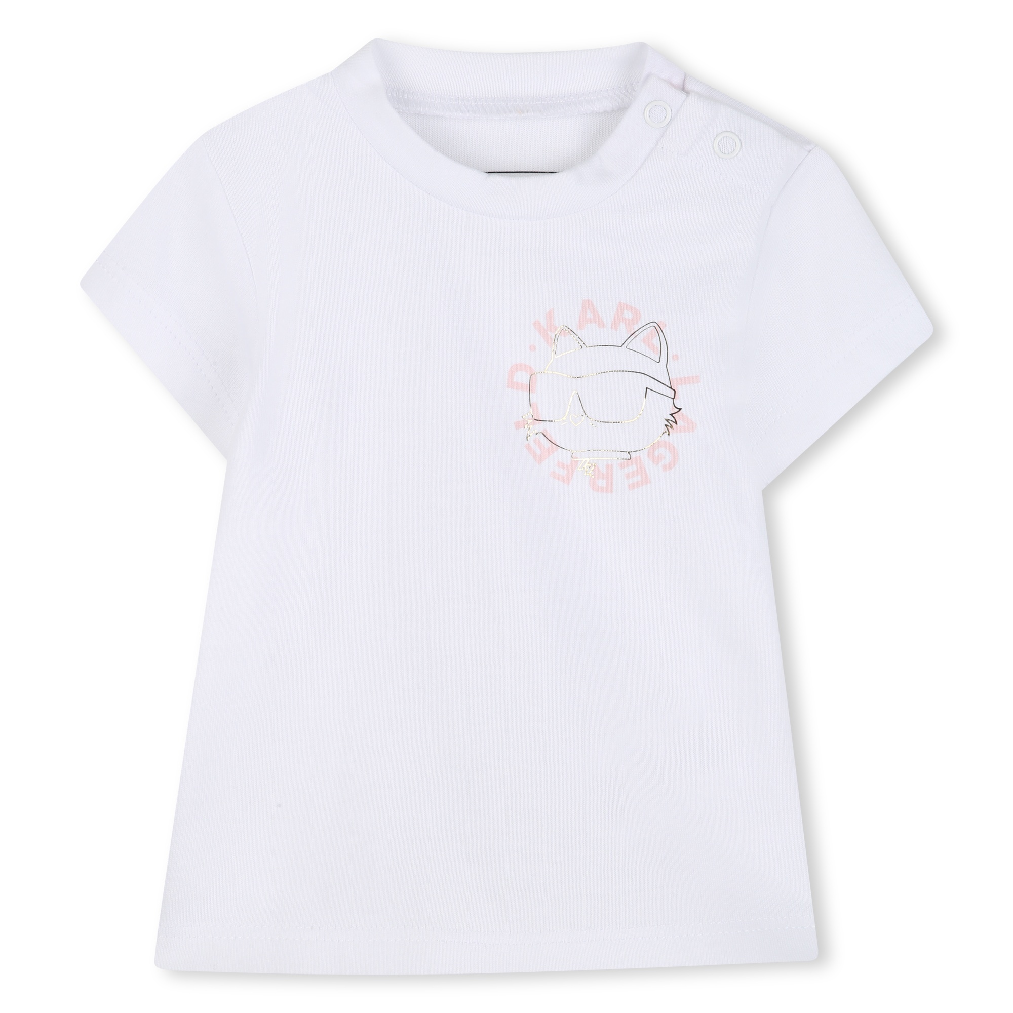 3-piece set: White T-shirt with a kitten print and snap buttons on the left shoulder, pink jacket with a gold print on the back and a black zipper, and pink dress pants with gold buttons and an elasticated waistband.