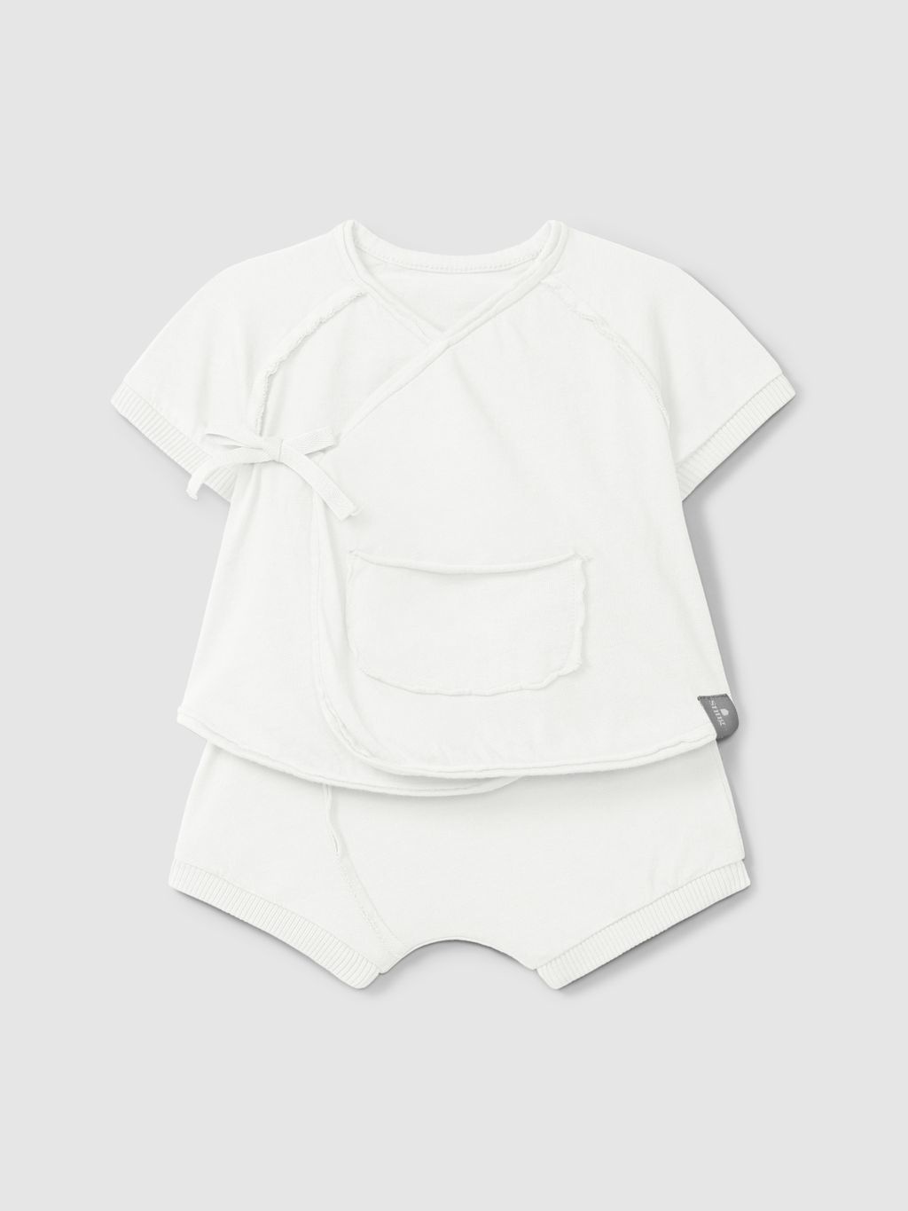 • Two-piece white set including a short-sleeved top and shorts.