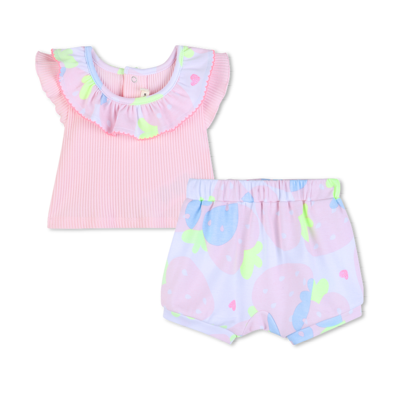 • Multicolored two-piece set including a short-sleeved top and shorts.