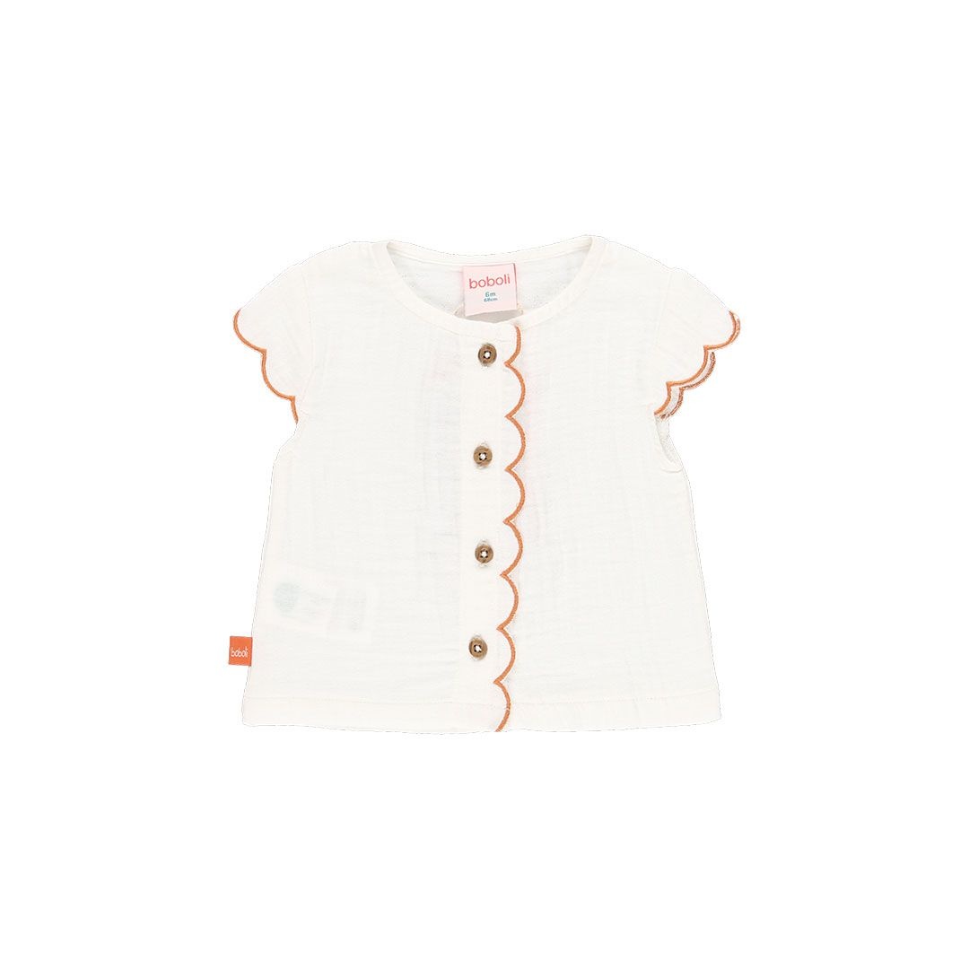 • Two-piece set including a short-sleeved white top and caramel-colored printed shorts.