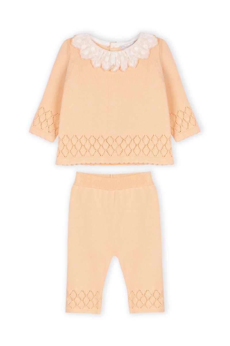 • Peach-colored 2-piece knit set.