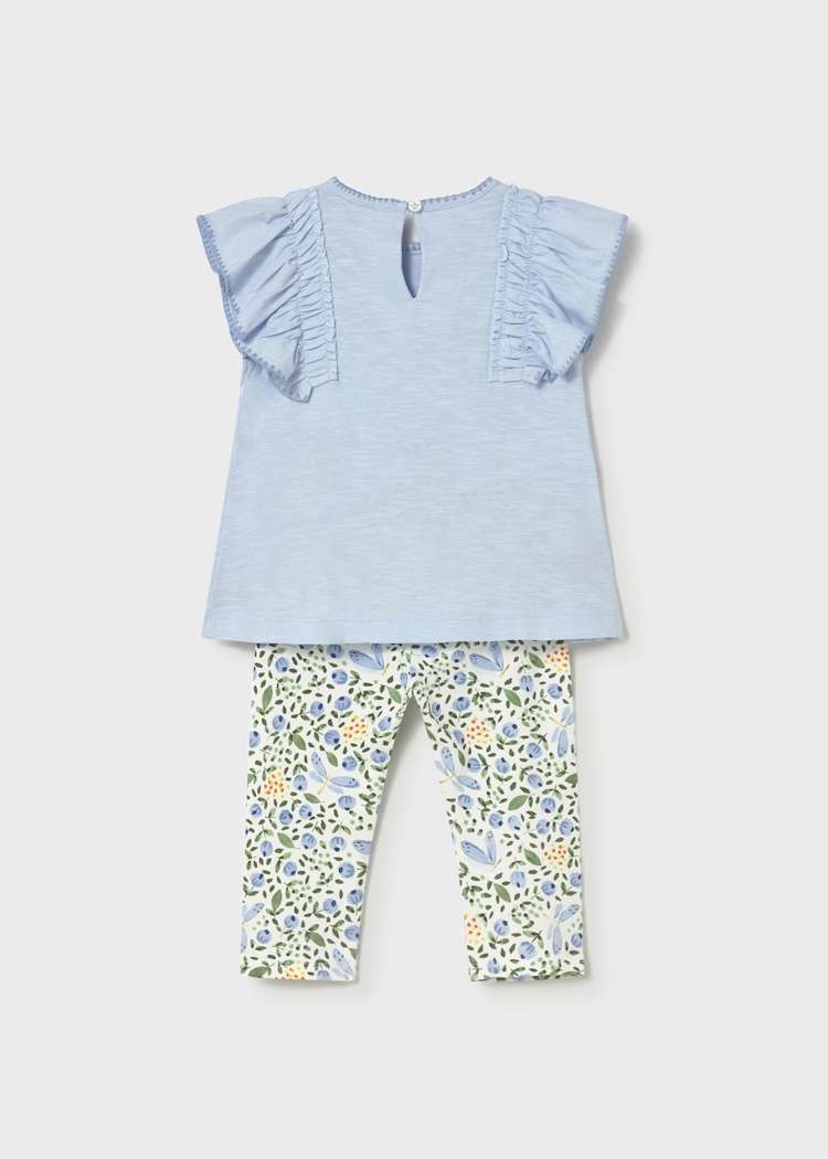 • Two-piece cotton set including a blue short-sleeved top and floral leggings.