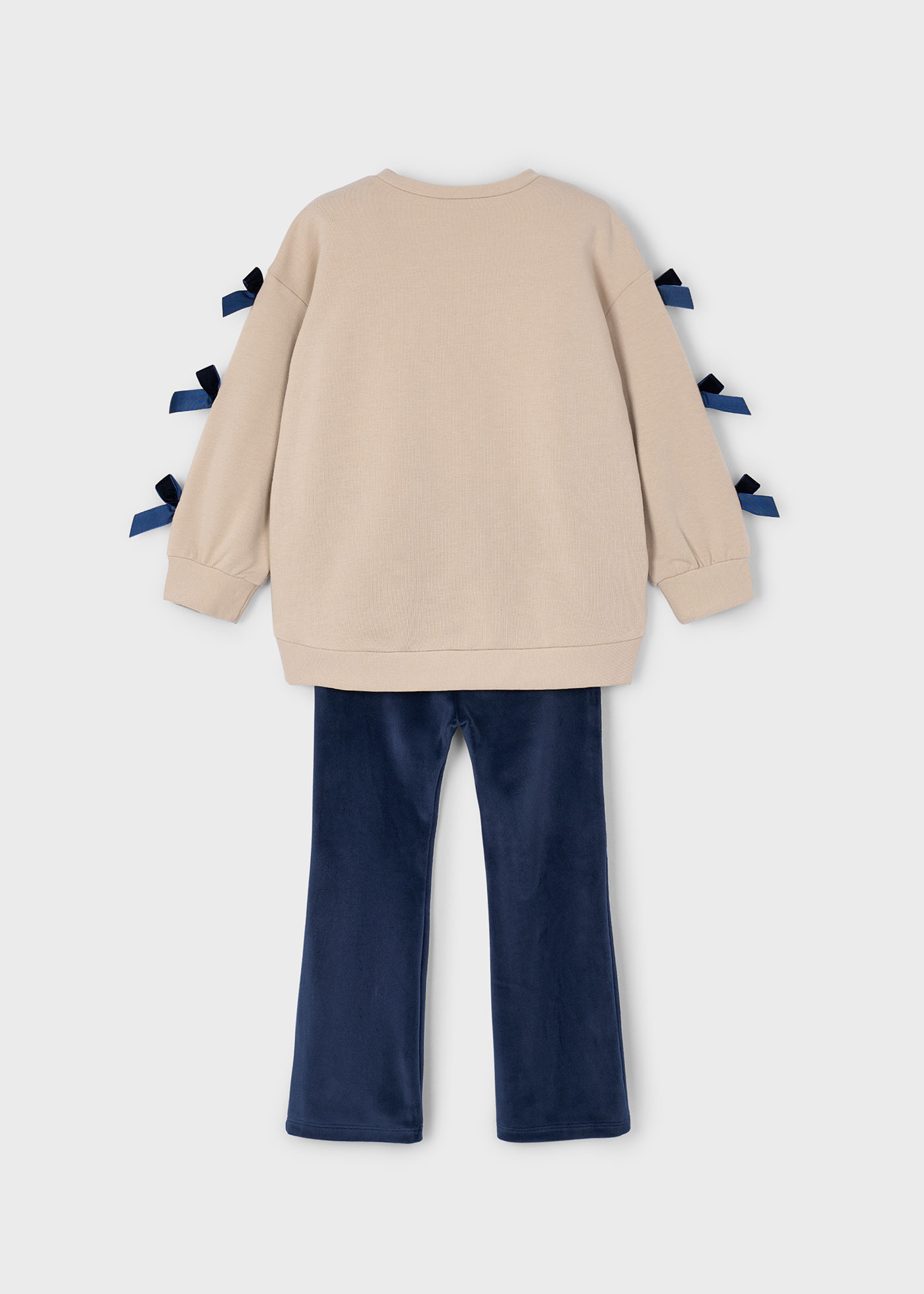 • Two-piece set including a beige long-sleeved top and blue velvet leggings.