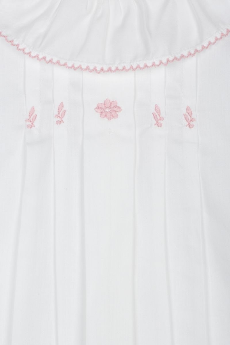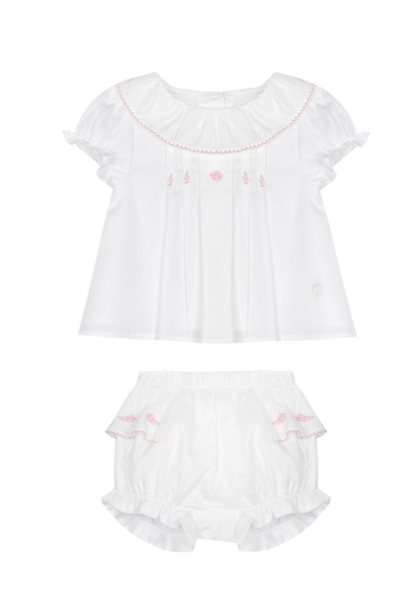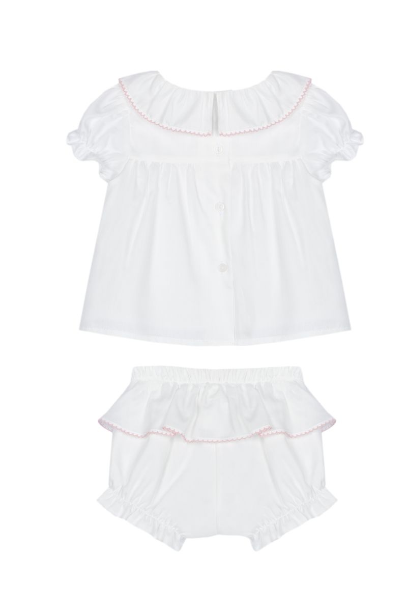 • Two-piece white set including a short-sleeved blouse with buttons at the back and matching panties.