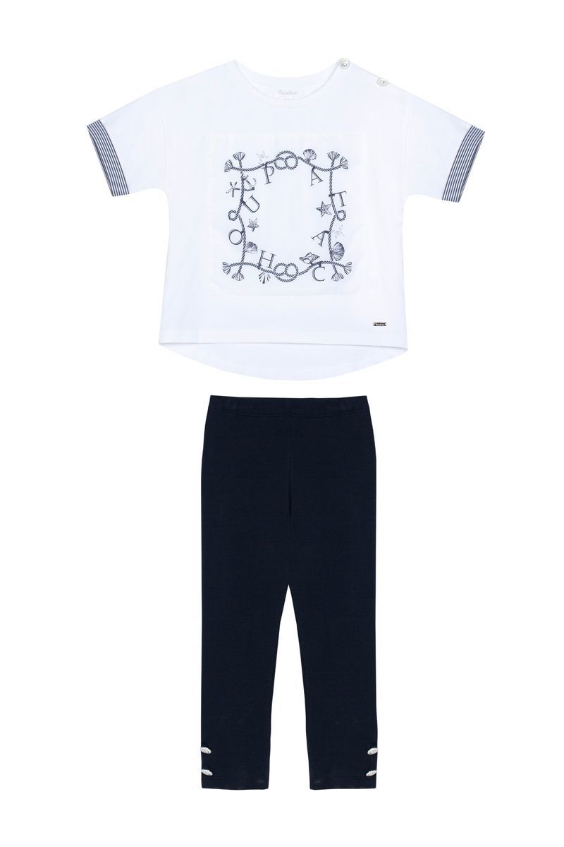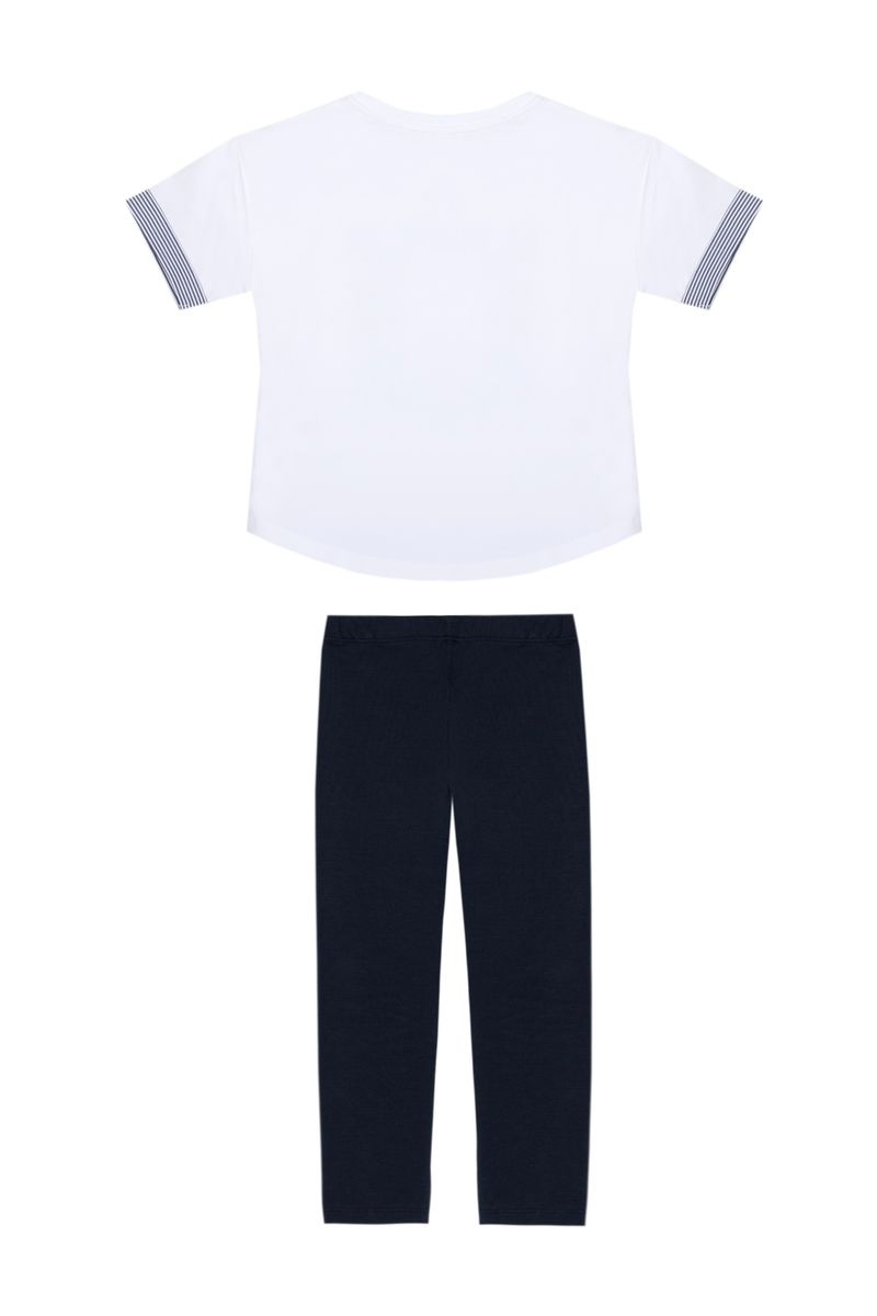 • 2-piece set including a white printed short-sleeved top and navy blue pants.